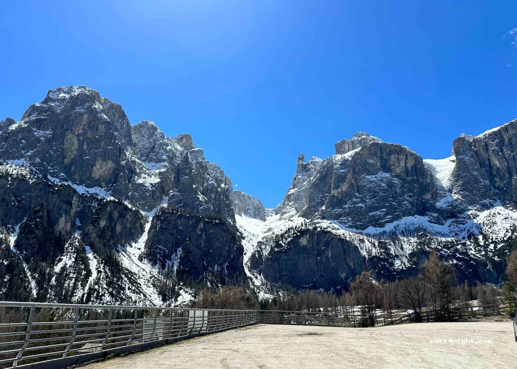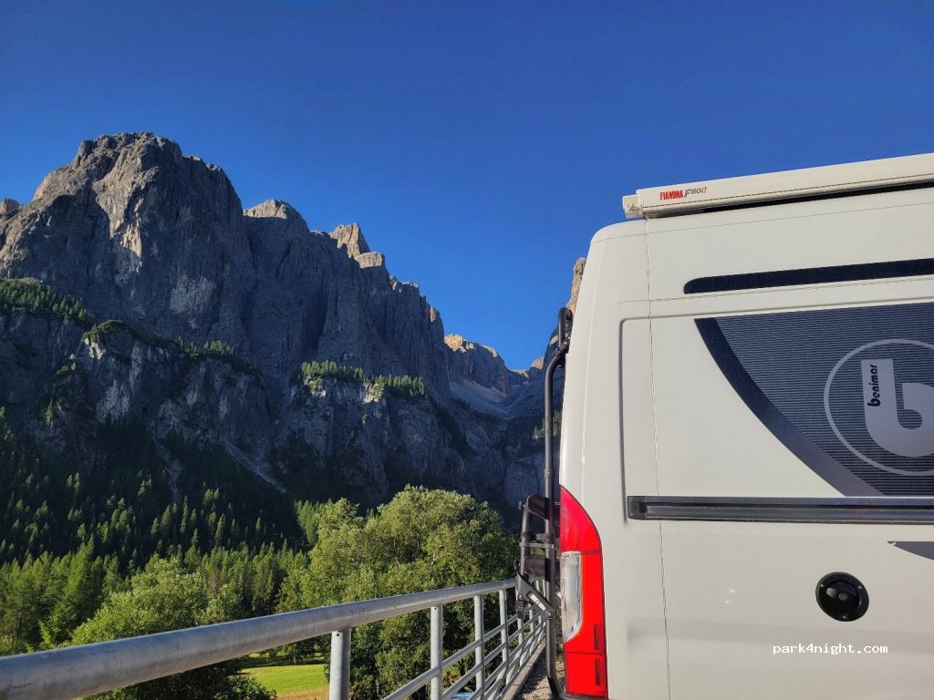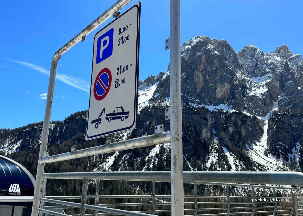 A fine agosto 2024 nessun divieto di sosta notturna. Parcheggio gratuito e comodo per muoversi a piedi, bici, bus e impianti molto vicini. Fondo in breccino e niente fango in caso di pioggia. Andando a valle giardini pubblici con wc pubblico e fontana in cui ci si può rifornire con tanica.