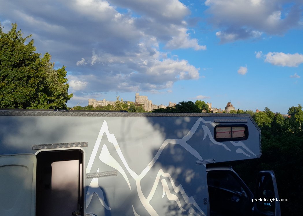 Countryside road within a stones throw of Eton College and with fantastic views of Windsor castle along the river Thames. Often dog walkers or cyclists passing by. Not suitable for large motor homes. Free parking, no restrictions.