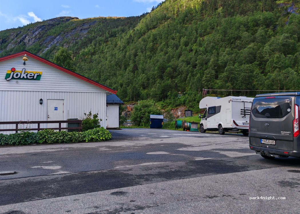 Man parkt rechts neben dem Joker Supermarkt. Wir waren dort ganz alleine und man hat einen tollen Blick ins Tal. Toiletten super sauber und kostenlos. Dusche kostet 30NOK und befindet sich in der behinderten Toilette, auch super sauber - dafür zahlt man gerne.
