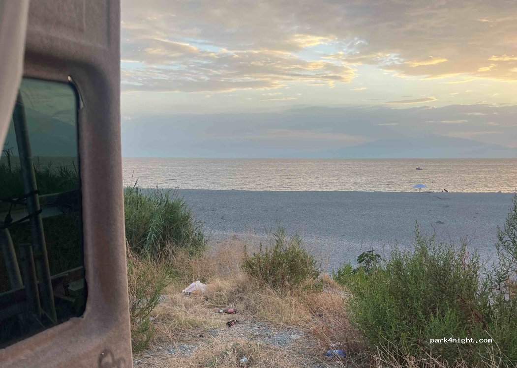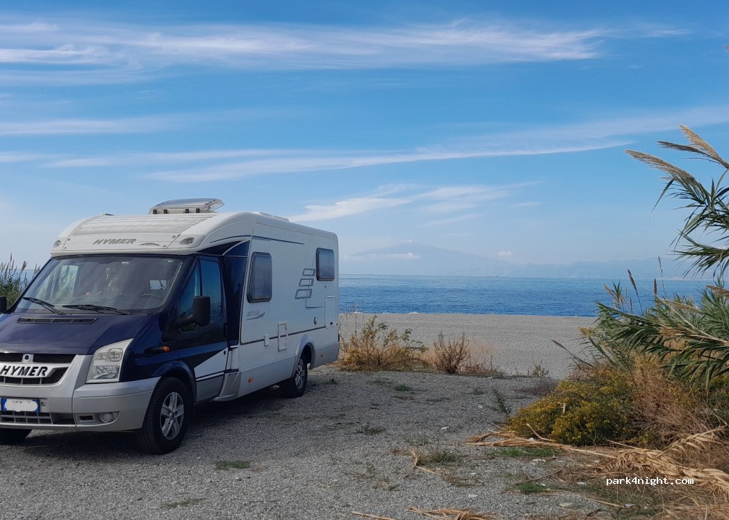 Bellissima vista sull’Etna. Parcheggio praticamente sulla spiaggia con acqua limpida e pulita. Silenzioso la notte. Al mattino (noi abbiamo dormito qui a dicembre) solo locali che facevano jogging. Purtroppo l’immondizia come sempre è presente…