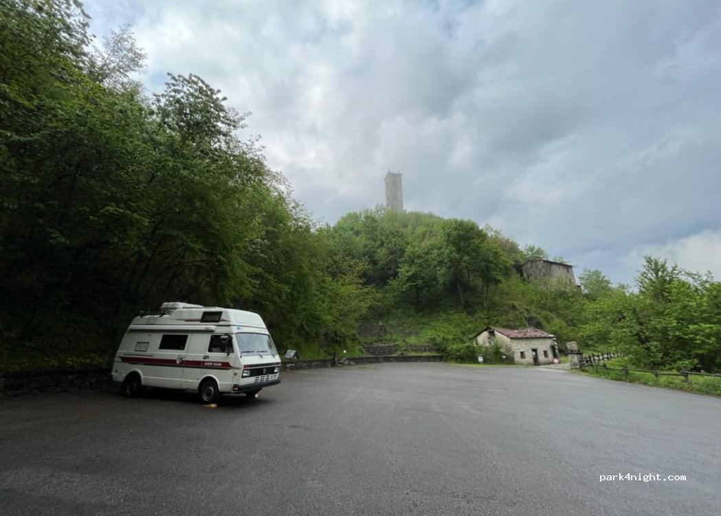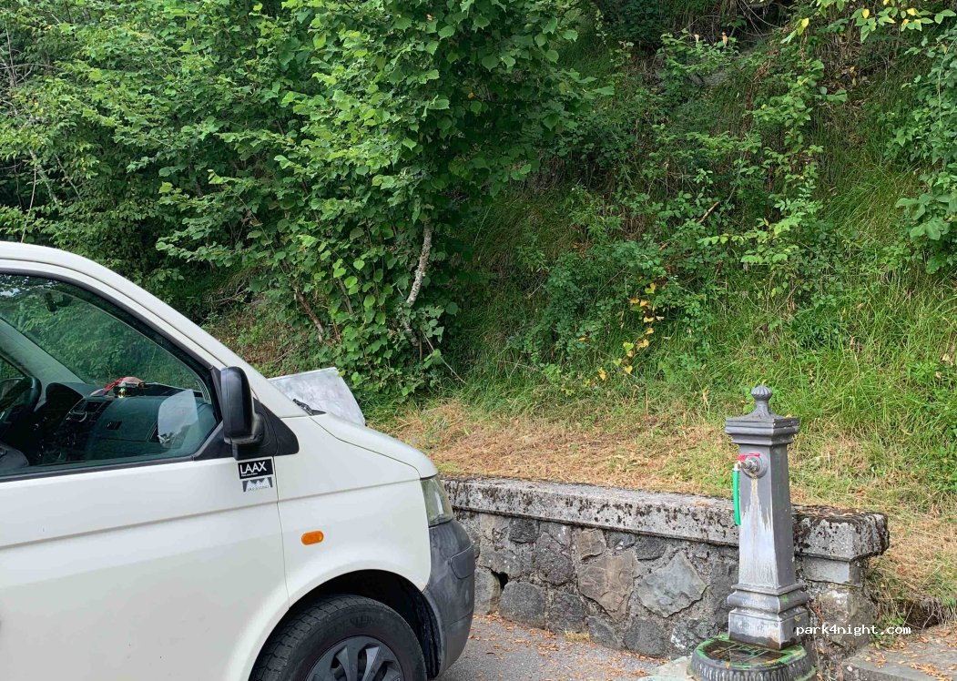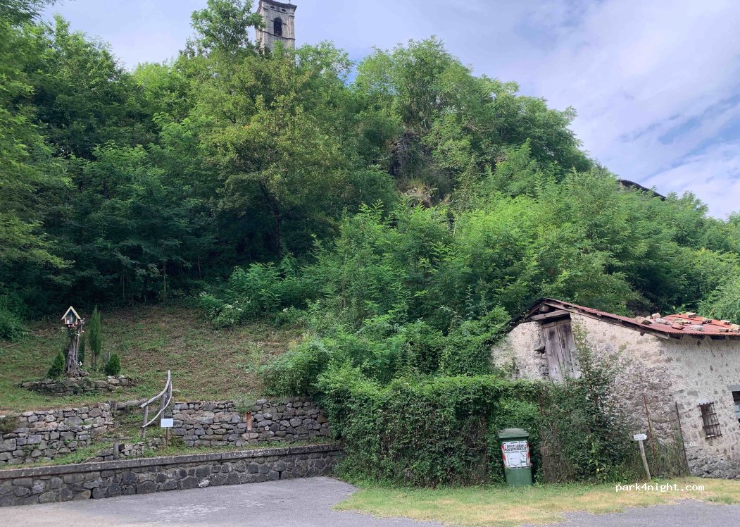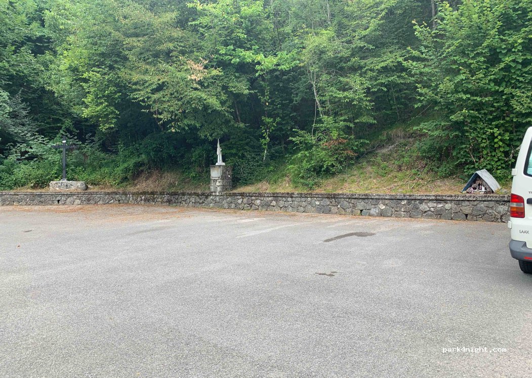 Free parking (there are no signs) near the old church, sloping, on asphalt, wide maneuvering radius, but the road to get there is very narrow, beware of tree branches lower than 3 meters. a very tight hairpin bend to get there.