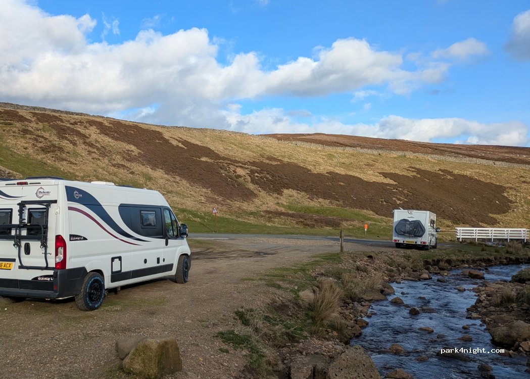 The second of two places near my home. Parking on either side of the stream by the ford. There are some steep bends on the single track road, so not suitable for a very large campervan. There is gastrofood at the CB Inn 2km away. The Red Lion Pub in Langhwaite is very traditional but does not serve food. Nearest shops are Reeth, 10km. Nearest supermarket is Richmond, 20km.