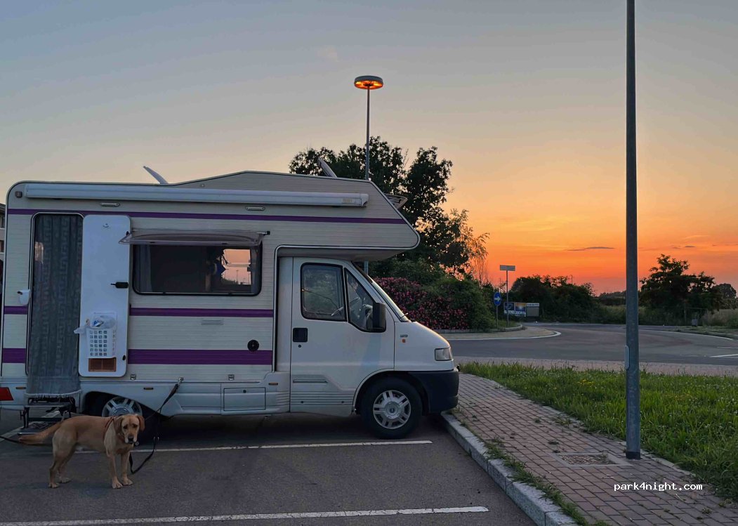 Grand parking parmi les champs verts, près de la route (avec peu de circulation la nuit). A pied vous arrivez à une laverie qui est aussi pratique pour laver les accessoires et couvertures pour animaux. J'ai passé la nuit ici en sortant de l'autoroute de Bologne