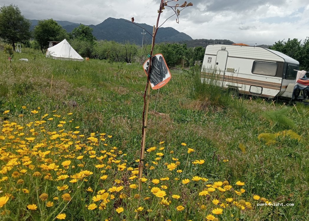 Eco-progetto a conduzione familiare dove é possibile pernottare con piccoli camper o van e caravan. Possibilità di mettere la propria tenda nel Meleto o usufruire della Bell tend. A disposizione degli ospiti cucina esterna con acqua potabile, elettricità, stoviglie, gas, frigo, area BBQ e fuoco. Compost toilet e doccia esterna (acqua a temperatura ambiente). A 2 passi dal fiume (piccole gole).