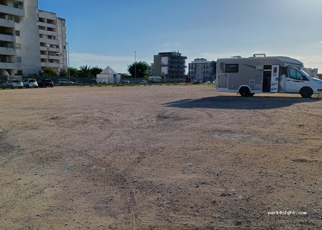 Vasta fascia mediana ghiaiosa, pianeggiante, ma a tratti sconnessa, utilizzata come parcheggio da poche auto. Ci siamo fermati lì per andare all'ospedale che è proprio accanto. Non c'è nessun cartello di divieto. Non abbiamo passato la notte ma sembra possibile.