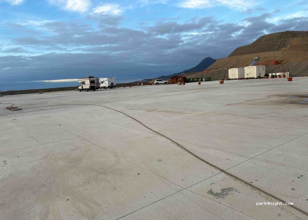 Ein Stellplatz auf Beton an einer Industrieruine. Die junge Frau beim Check in, super nett und lustig. Alles komplett entspannt und problemlos. Der Platz liegt direkt am Meer, im Hintergrund Berge und eine Industrieruine, sieht sehr außergewöhnlich aus. 1x Toilette, 2x Dusche, alles sauber. Wir haben 20€ incl. Strom, Ver/ Entsorgung bezahlt, völlig ok. Der Ort bietet alles was man möchte.