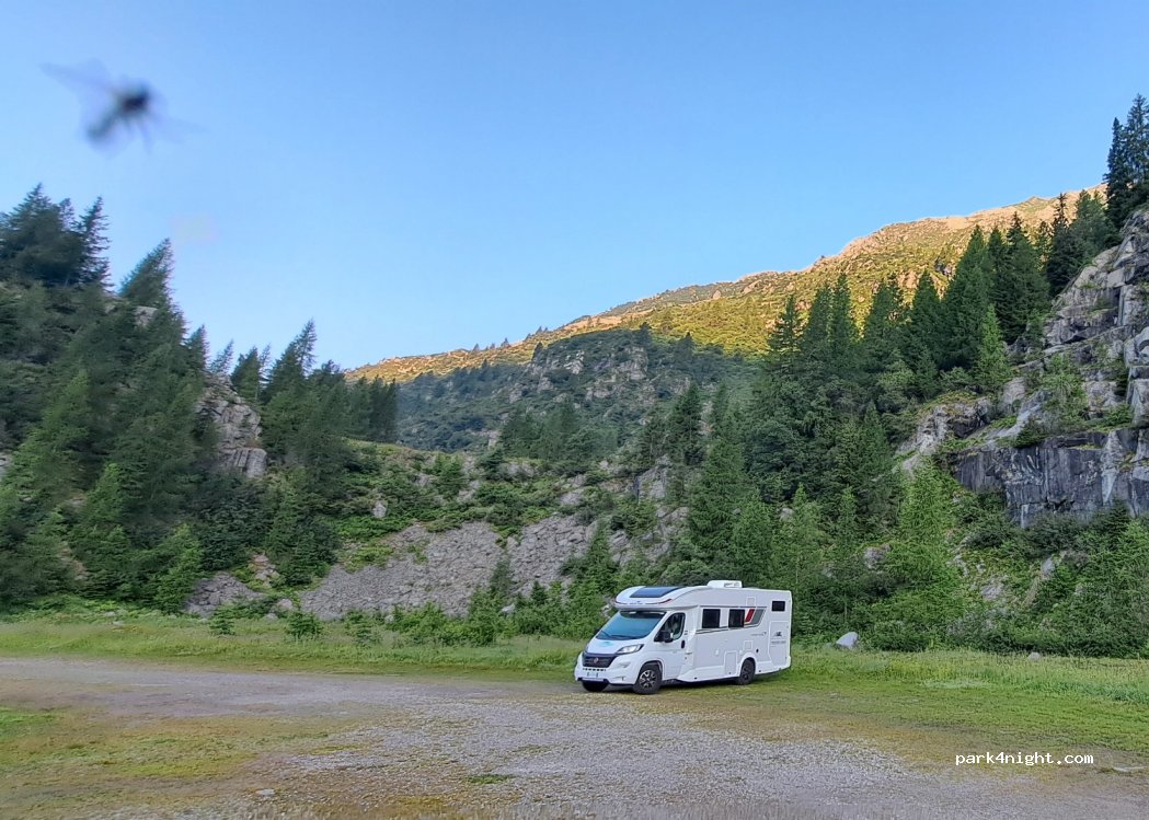 Parking at the end of the Daone Valley. There are public toilets on site with water safe to drink. At the beginning of parking you can empty used water and load drinking water (no hose available). The site is an ideal starting point for walks into the Fumo valley and hiking in the Adamello mountains. Take note that the road into the valley is closed in winter for snow. It is usually reopened in late spring.
