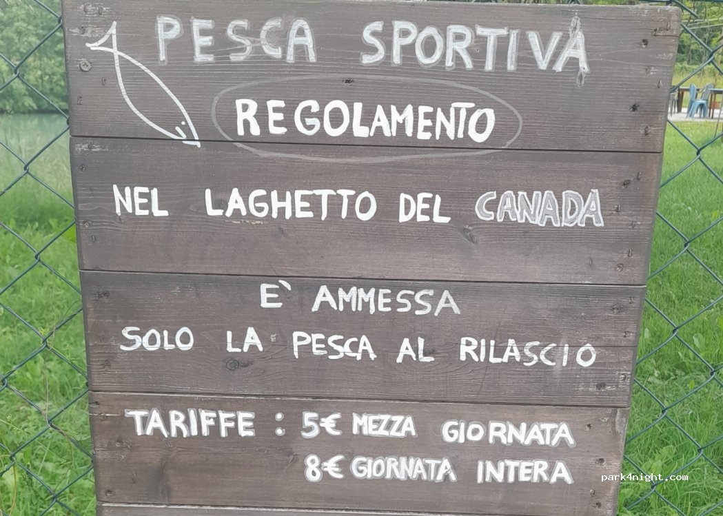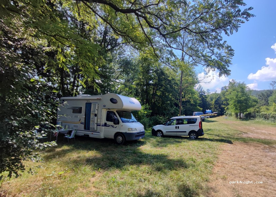 il gestore del ristorante bar mette a disposizione gratuita una zona a prato per la sosta,in piena estate nel pomeriggio assolato ma al tramonto e di sera molto piacevole, nessun servizio se non la pace e la natura oltre al fiume dove potersi rinfrescare, libertà completa per i nostri amici 4zampe