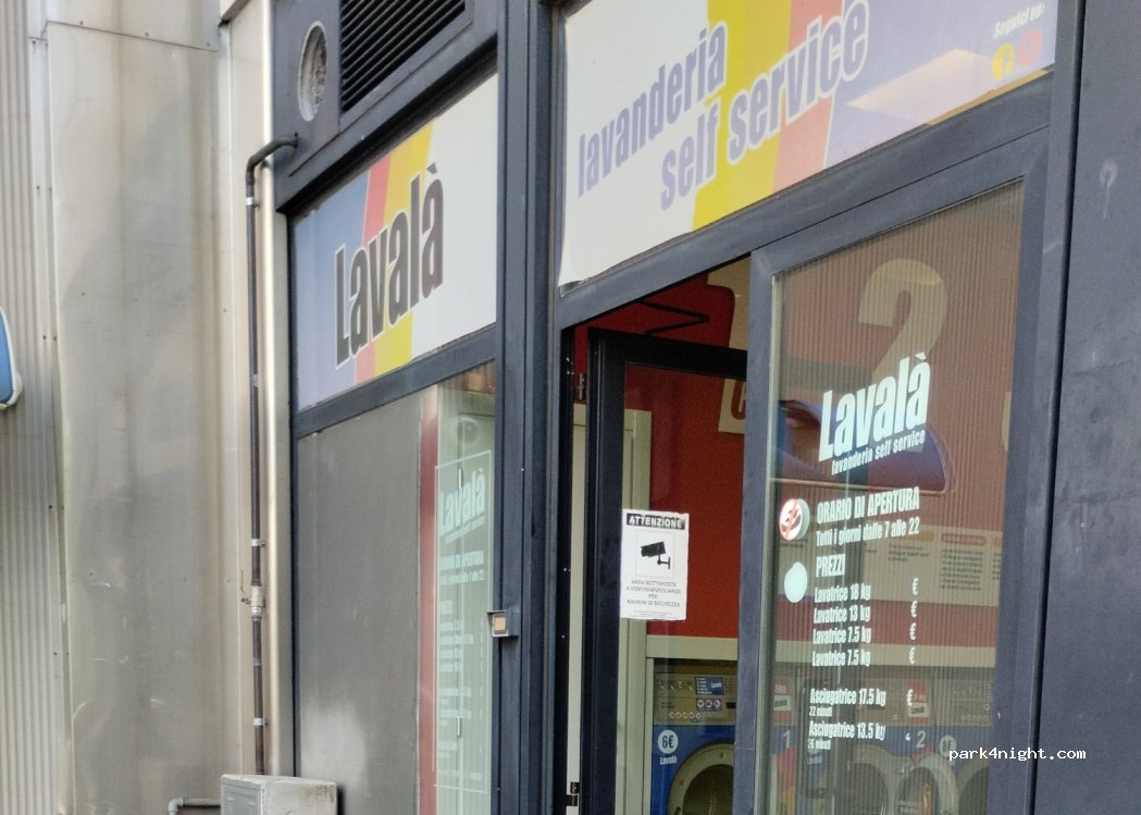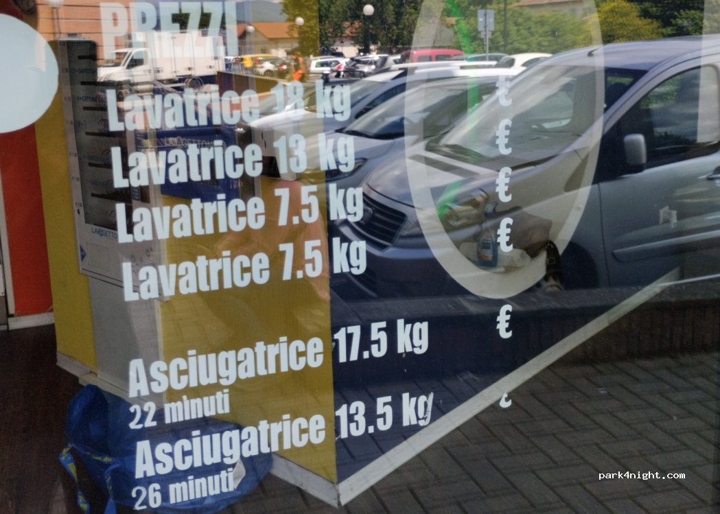 Lavanderia automatica a gettoni con ampio parcheggio del supermercato, prezzi nella media