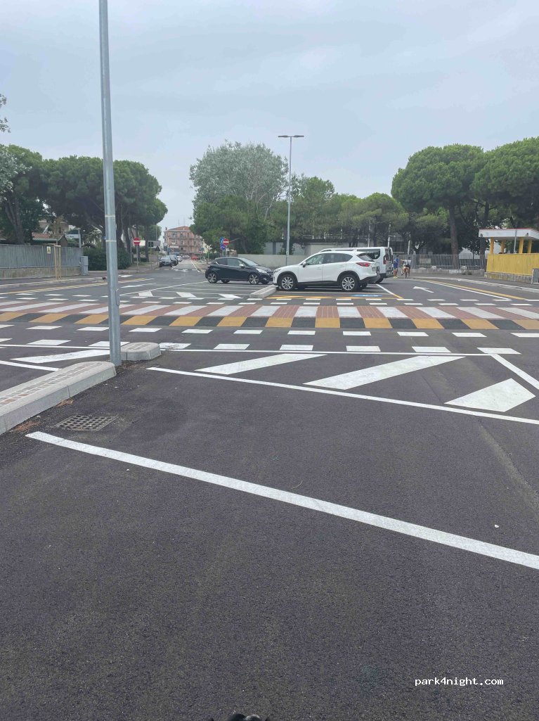 Parking à voitures, difficile de garer un camping-car, je déconseille fortement, bien pour un van où petit Cc au gabarit d’une voiture. La police italienne ne veut pas que le véhicule dépasse du marquage au sol .