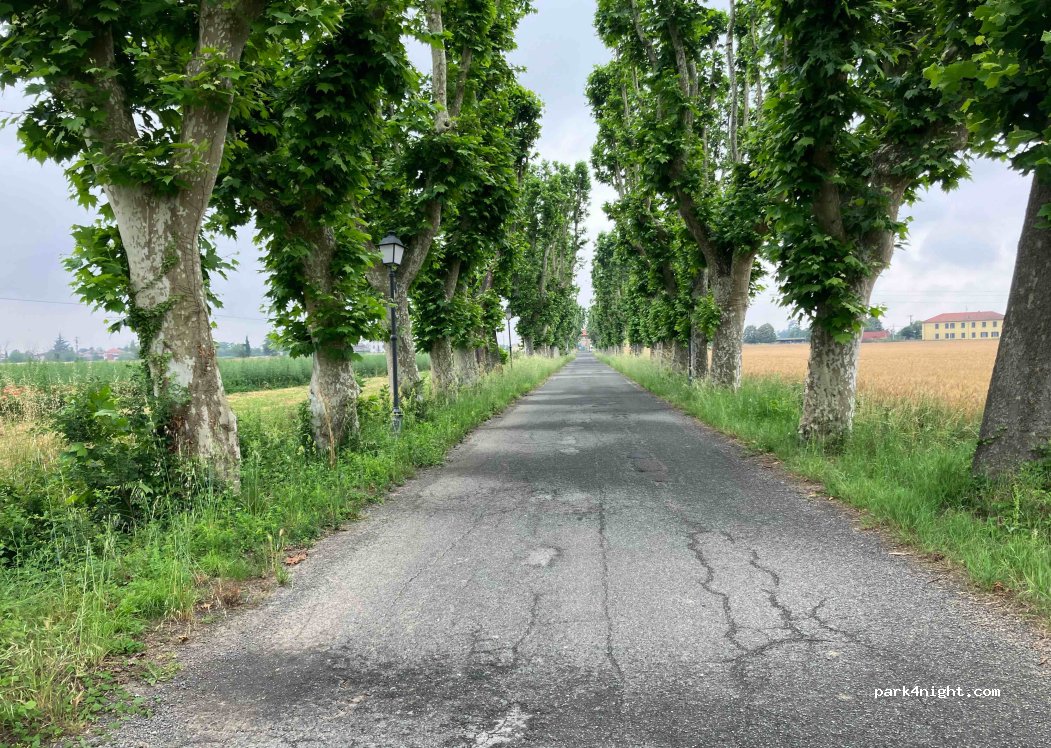 Bel parcheggio tranquillo e pianeggiante. Accesso tramite bel viale d'acero. Penso che sia molto tranquillo di notte, anche se è tra l'autostrada e la strada di campagna. Ho appena fatto una breve sosta per una passeggiata con il cane. Tutt'intorno campi di papaveri e grano.