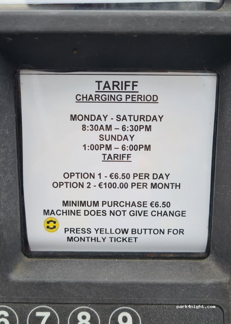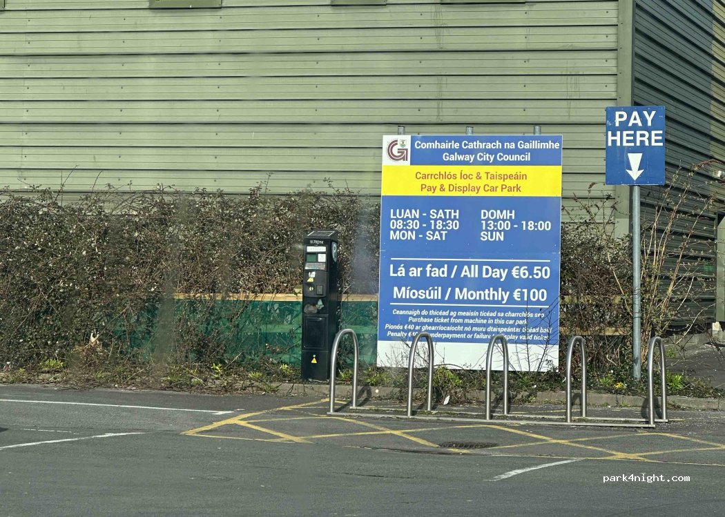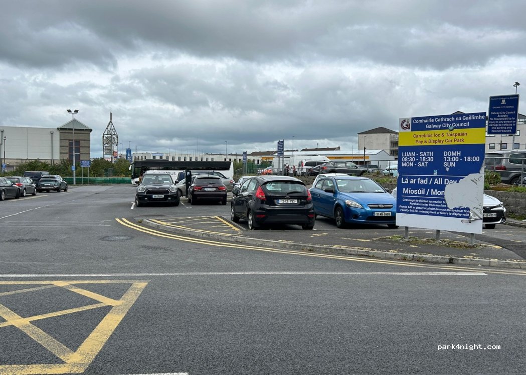 Large parking area for daytime access to Galway centre. Only 5 mins walk to town centre. €6.50 daily rate. My credit card didn’t work in parking meter so had to use coins.