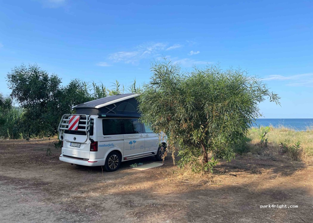siamo arrivati alle h.20 e non c era nessuno parcheggiato,e nessun ticket,solo la postazione, ma forse non ancora attiva ,essendo in costruzione il "lido". all' ingresso c è una sbarra,ma è aperta,anche la notte. abbiamo passato la notte tranquillamente,solo il rumore del mare... davanti, la spiaggia è libera ...