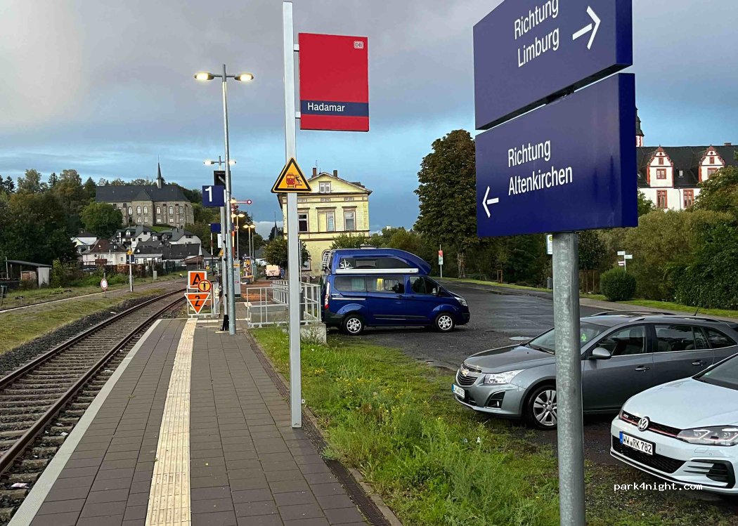 Zwei Stellplätze ohne Markierungen direkt am Bahnhof. Keine VE, kein Strom oder sonstiges. Von hier aus fährt ab und zu eine Regionalbahn von Limburg nach Westerburg. In der Nähe der Radweg R8. In 30 Minuten ist man mit dem Fahrrad in der Limburger Altstadt. Mehrere Restaurant sind fußläufig in wenigen Minuten zu erreichen. Alle einschlägigen Supermärkte in der Nähe.