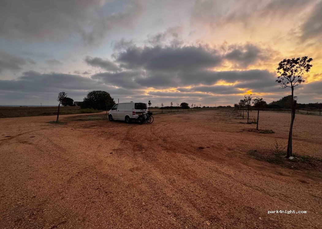 Zeer groot parkeerterrein waar de slagboom buiten werking is gesteld. Zee op fietsafstand. Toiletgebouw zit potdicht. Totaal geen voorzieningen. Snelweggeluid stopt 'snachts rond drie uur even. Prima geslapen. Wij waren de enige overnachters.