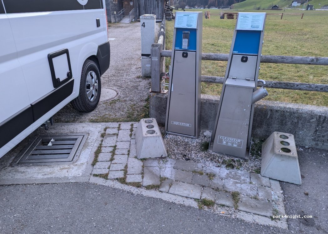 Ottimo posto con vista meravigliosa ,purtroppo qualche difficoltà nello scarico dovuto all'incompetenza di chi l'ha ideato e creato ( con le pendenze contrarie allo scarico con conseguente sversamento in strada di chi non c'entra il pozzetto, messo tra l'altro in un angolo in posizione scomoda ). Và comunque bene anche questo visto la grande carenza di camper service in tutta la valle .