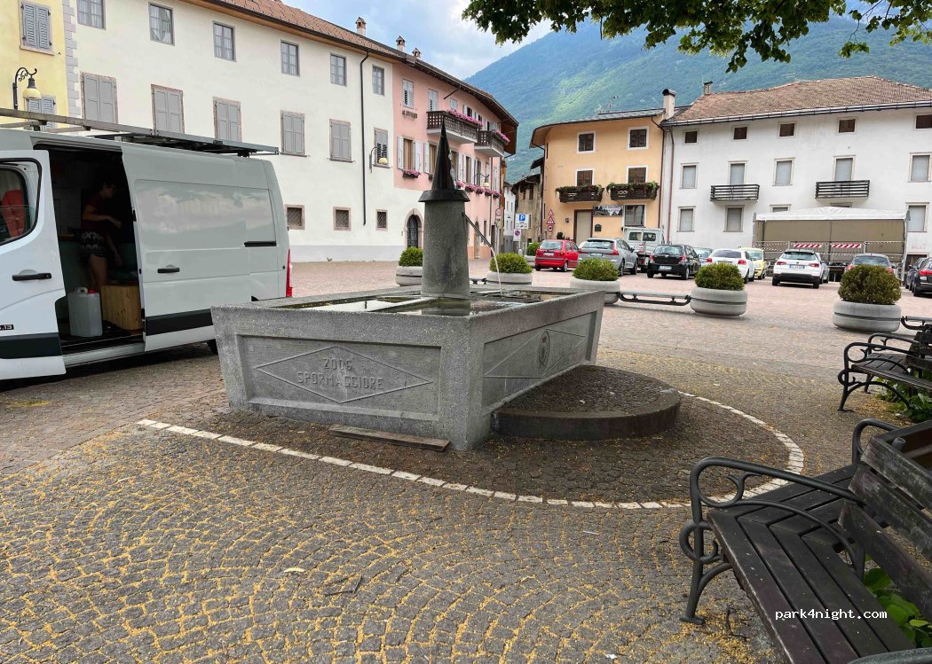 Fontana d'acqua in piazza, stare sotto il rubinetto per tenere il contenitore dell'acqua. Buon flusso, circa 10l al minuto.