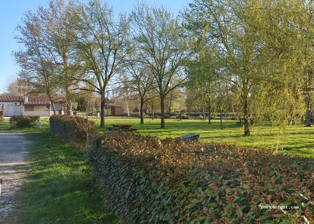 Bel emplacement dans la verdure. Vidange eaux grises possible. Globalement plat. 4 G orange poussive. Manque des poubelles. Très calme.