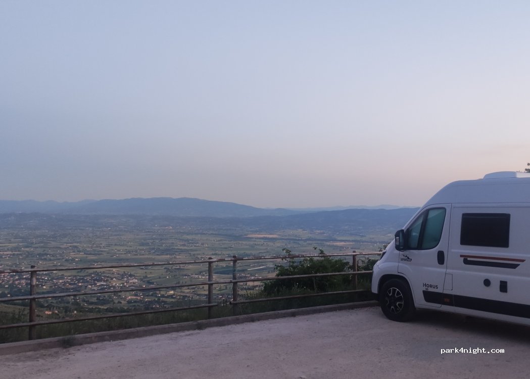 Vista incredibile, subito sopra Assisi, anche se la strada è un po' stretta e piena di tornanti per arrivare (forse per un camper è complicato). Il parcheggio è ampio ma non ci sono servizi e la sera può capitare che sia un po' frequentato, ma è abbastanza tranquillo.