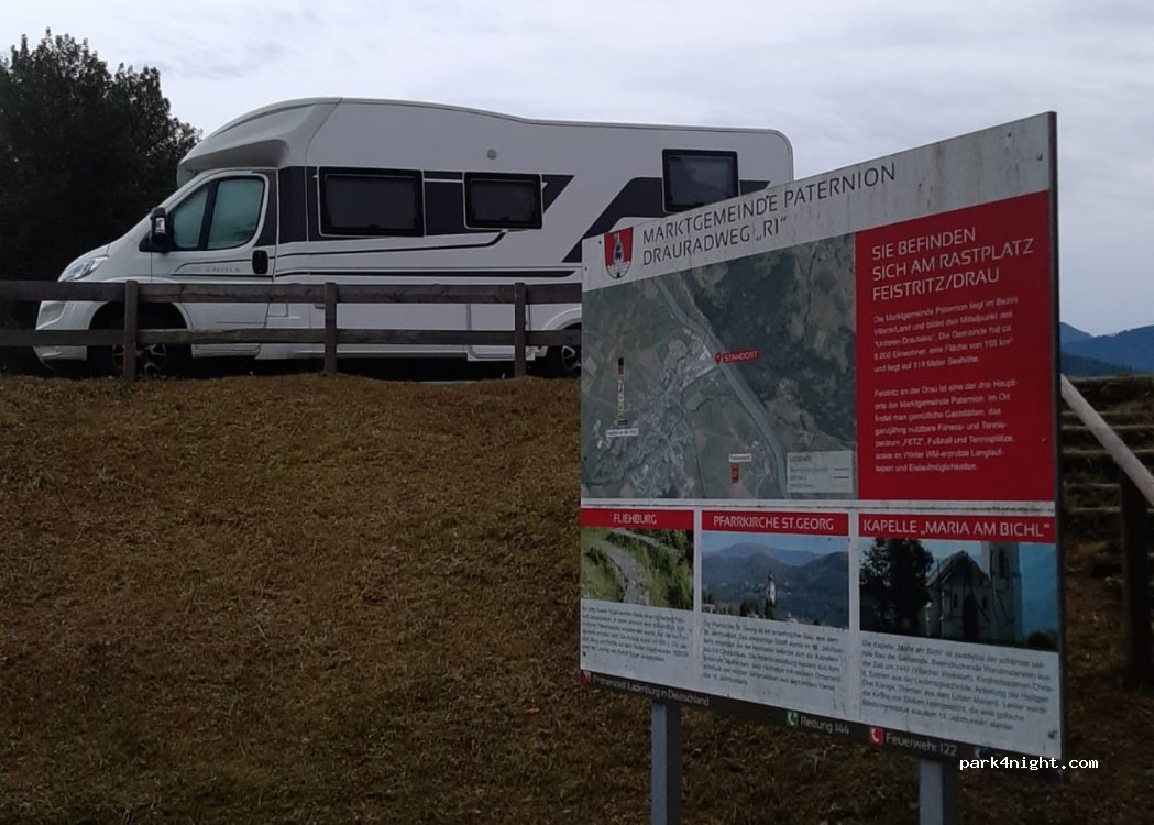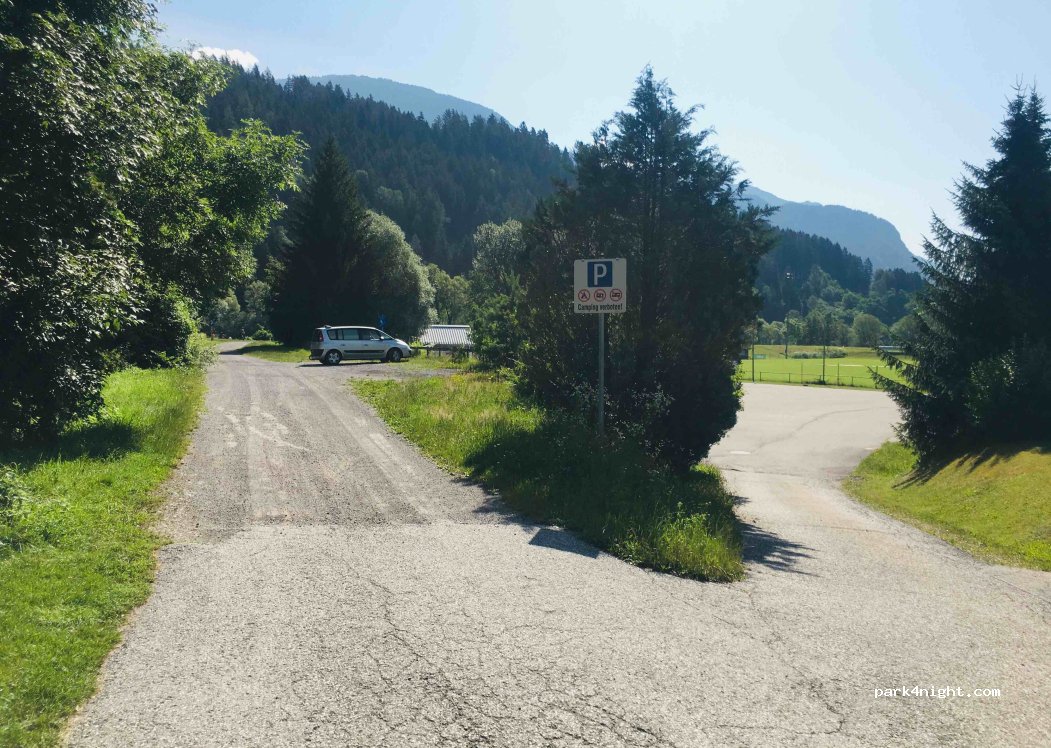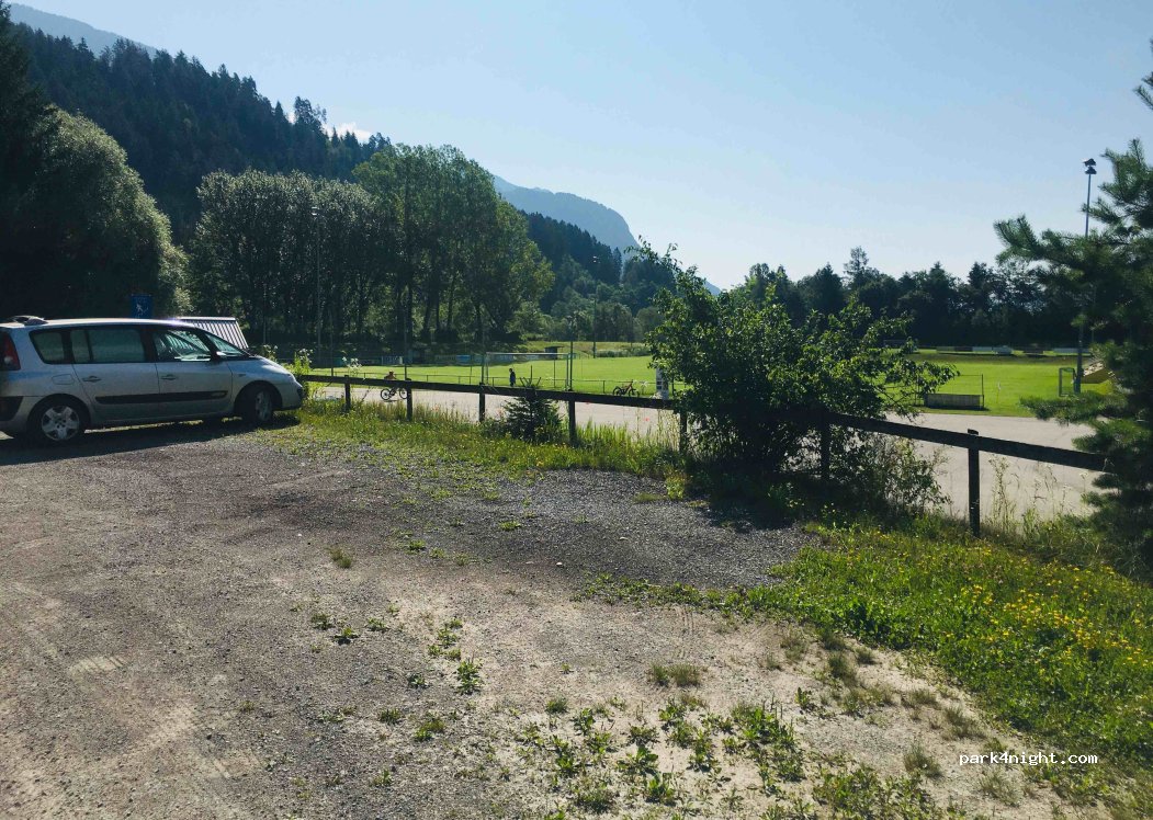 En realidad hay dos plazas de aparcamiento, una arriba y otra más grande (de hormigón) abajo. Justo al lado de un campo deportivo. Aparqué arriba porque había un evento abajo. ¡Prohibido expresamente acampar! (Ver señal de prohibición en la primera foto). Más abajo en el río hay un manantial de agua potable y un banco que lo convierte en el lugar perfecto para un picnic. Al otro lado del río hay una estación de tren, pero no se oye mucho.——————————————