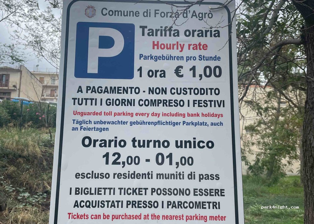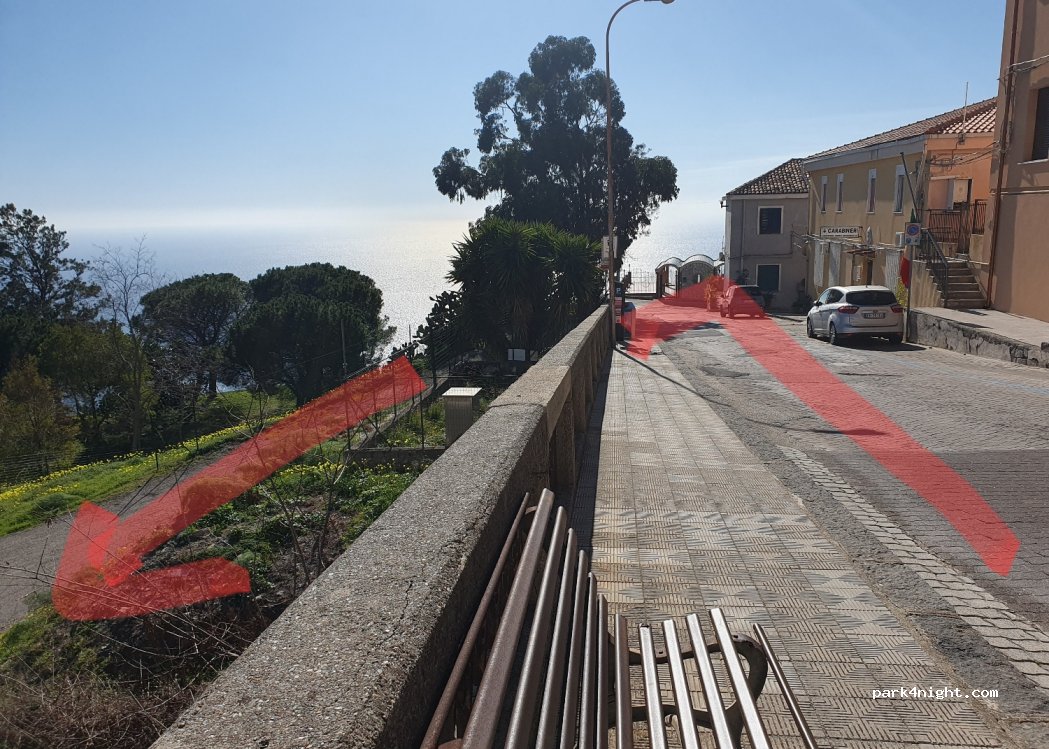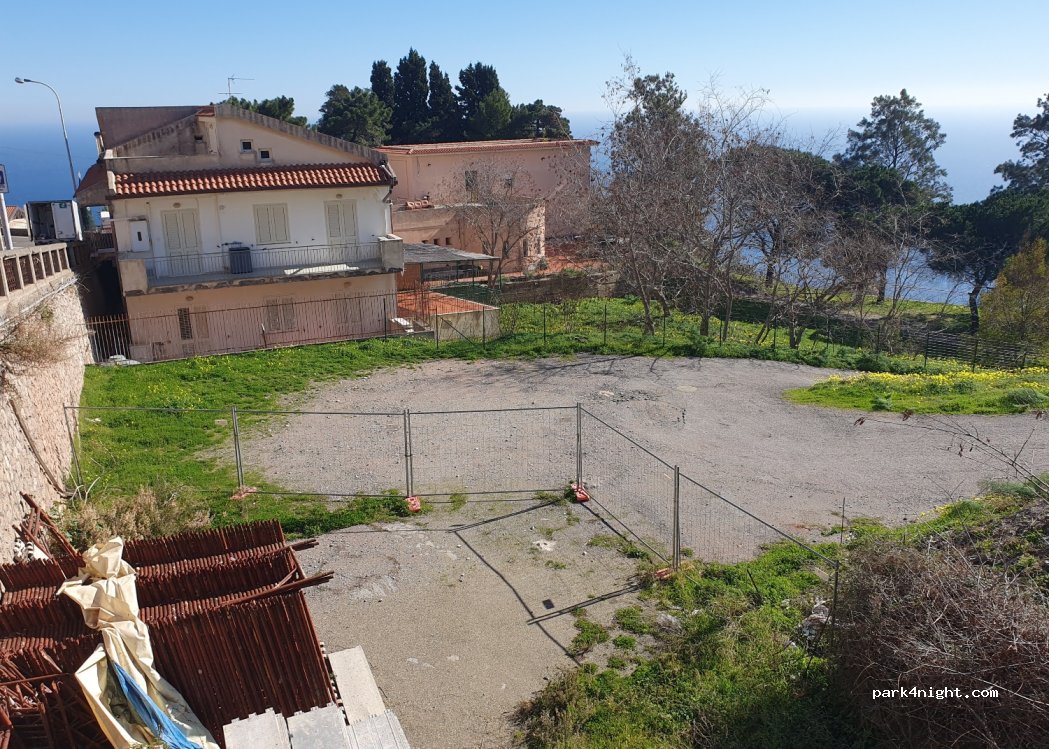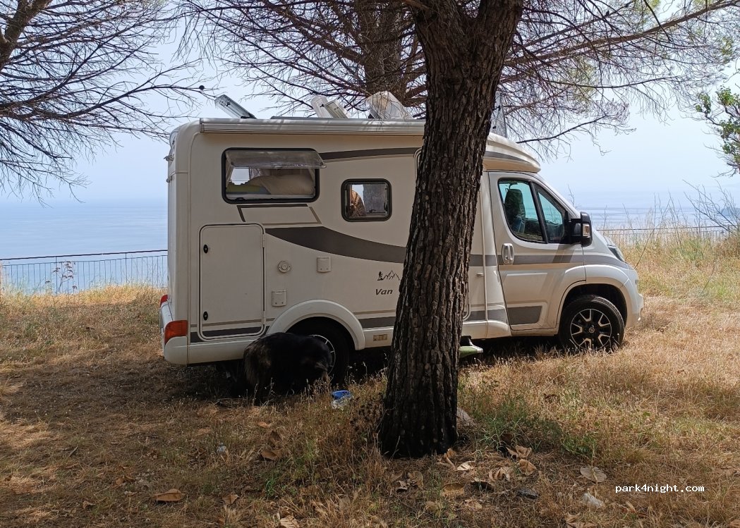 Parking area under the pine trees, with a panoramic view of the sea and Taormina, but be careful of the entrance with slightly low plants, excellent for day and night parking. Not suitable for motorhomes longer than 6 m