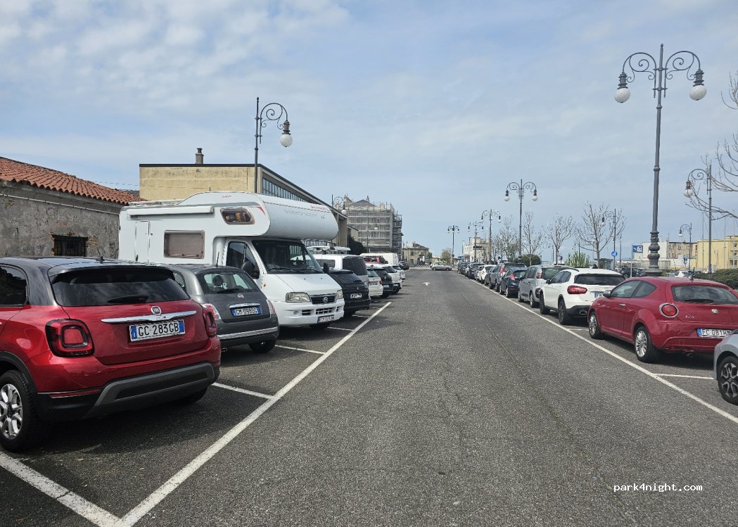 Ottima posizione ma parcheggi troppo piccoli per camper..noi con un van da 6m non riuscivamo a stare nei parcheggi a spina di pesce, uscivamo troppo con il muso..temendo una multa ci siamo spostati in quelli lungo il bordo occupando più di un posto auto..per una giornata di visita ci è andata bene, ma non so se lo consiglierei per soste più lunghe o per dormirci..