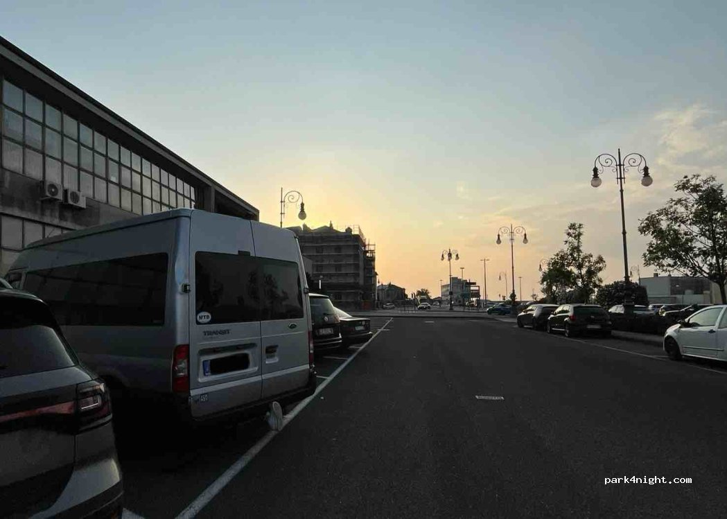 Parcheggio per auto con strisce bianche, abbastanza vicino al centro, tranquillo, dormito una notte, sono solo un po’ stretti gli stalli per parcheggiare, ma con un camper di 6m siamo riusciti ad entrare nelle strisce.