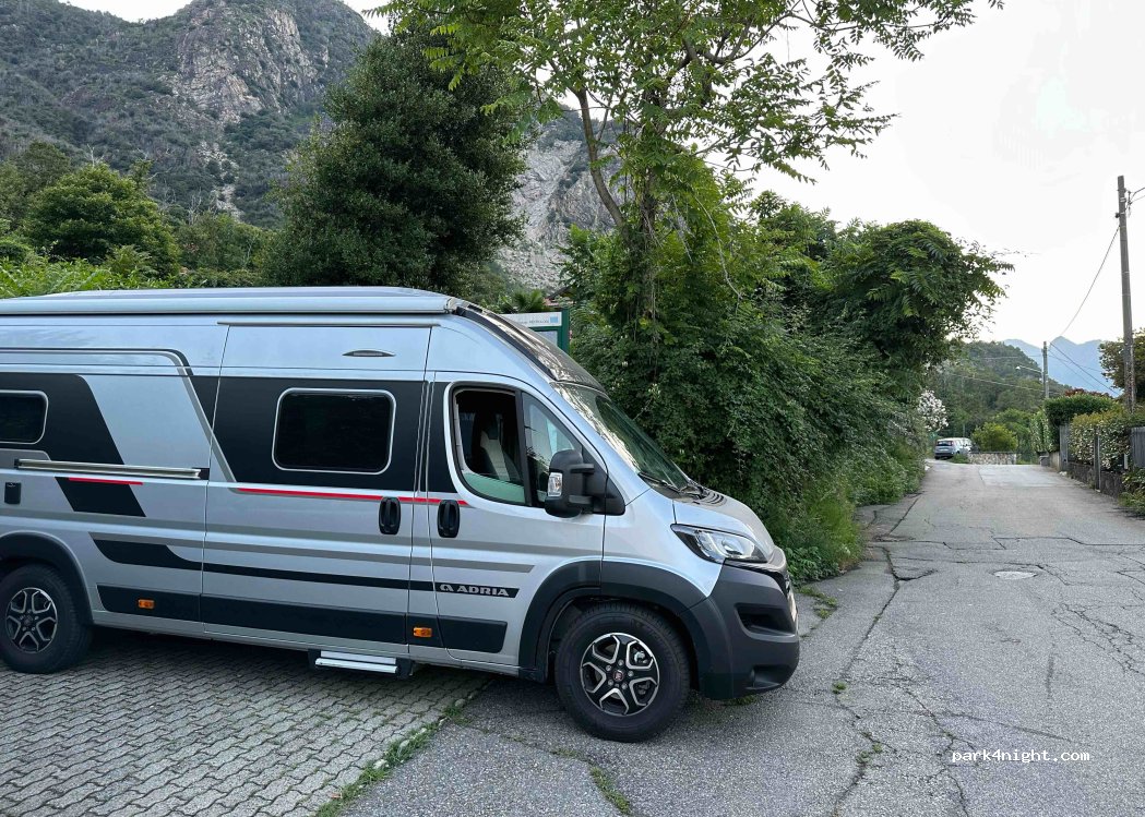 Posto tranquillo su strada non frequentata. Appena sopra ad un campeggio. Utile e interessante per passare la notte, non per periodi maggiori. riesce a parcheggiare un camper fino a 7 m. Nelle immediate vicinanze ci sono altri posti adatti per il camper, anche con bella vista sul lago