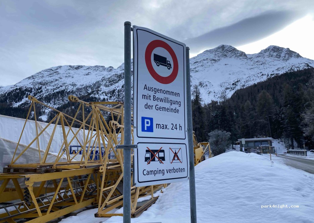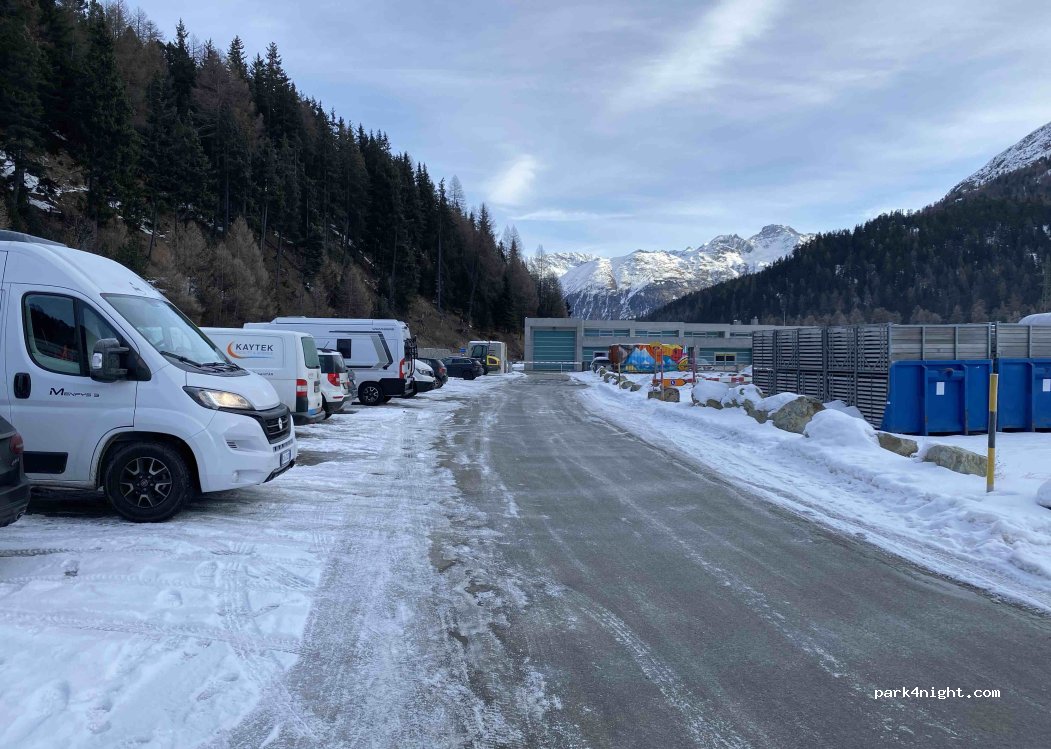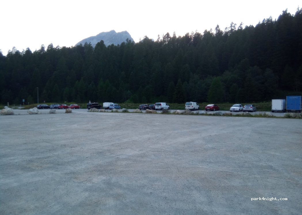 1,5 km avant St.Moritz, juste à côté d'un camping. Aucun camping autorisé. Gratuit, relativement calme, bon point de départ pour découvrir la ville et les environs
