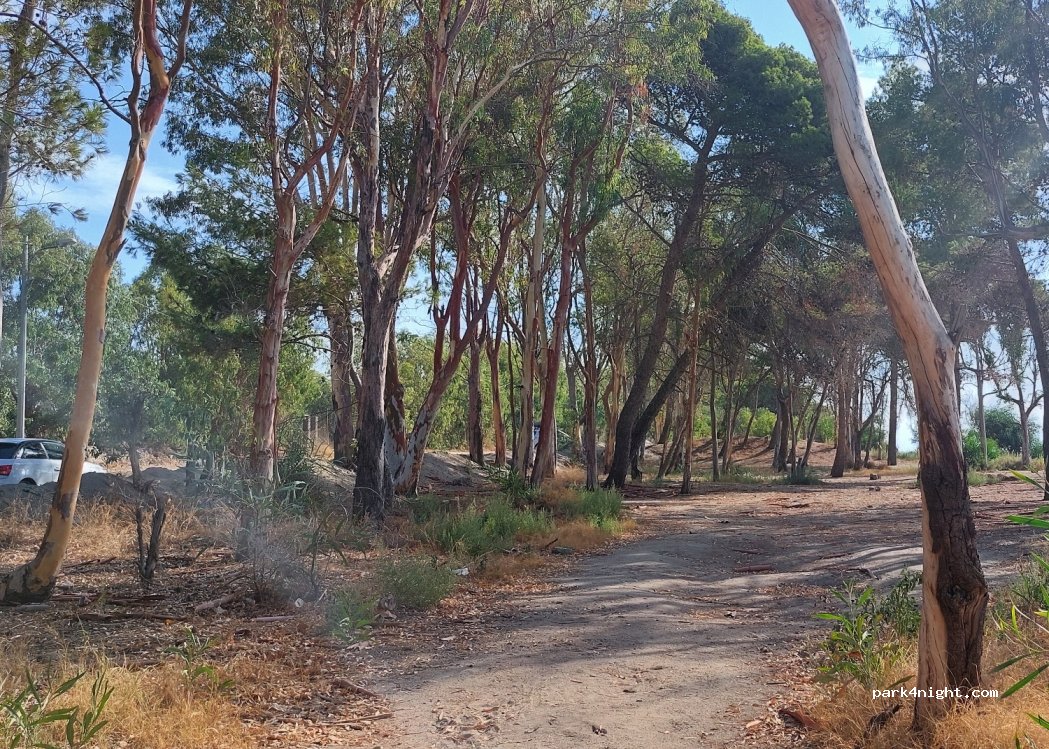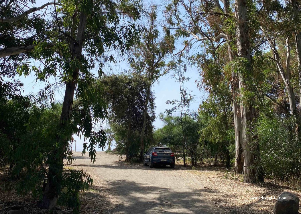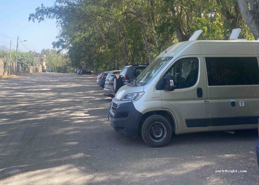 Ein mehrere hundert Meter langer Parkplatz. Es bietet Zugang zum Strand, der 25 m zu Fuß entfernt ist. Kein Campingverbotsschild. Etwas Müll auf dem Parkplatz, aber es ist Sizilien. Es gibt viele Parkmöglichkeiten, aber die schönste ist am Ende der Straße. Ab Mitte September kostenfreies Parken.