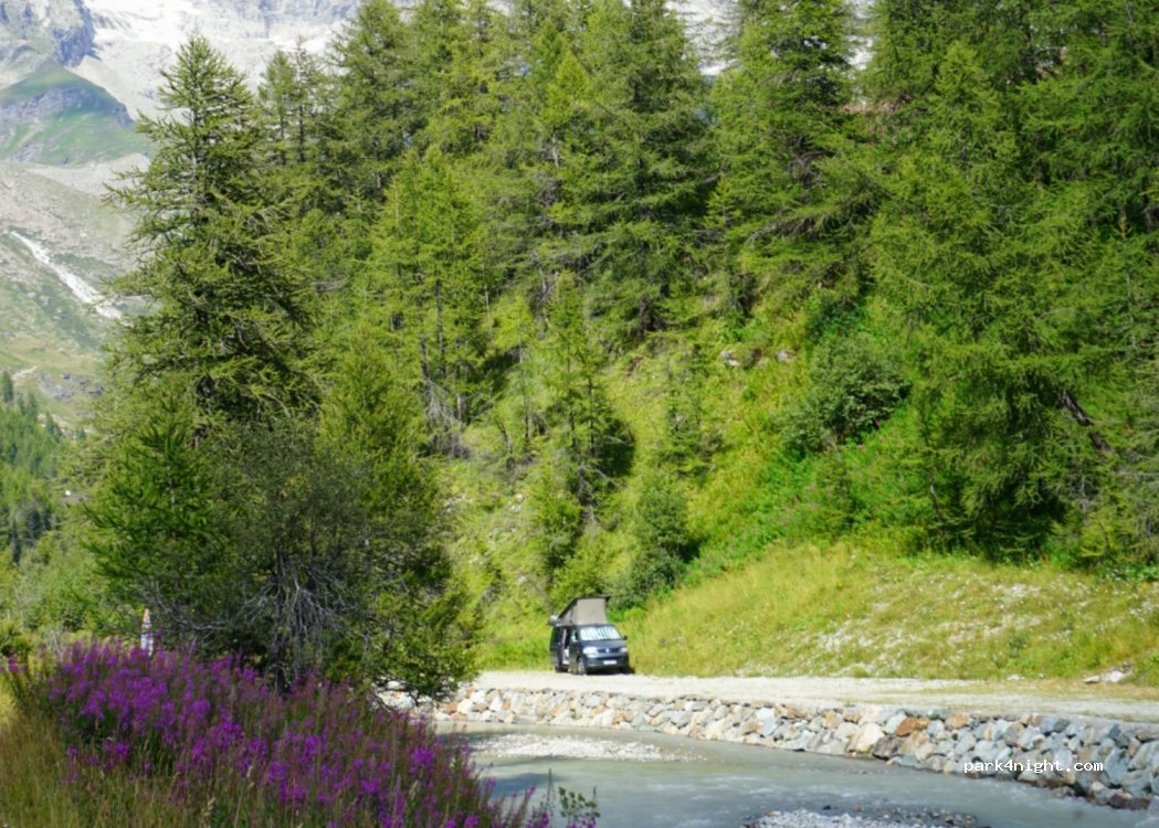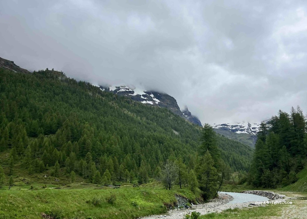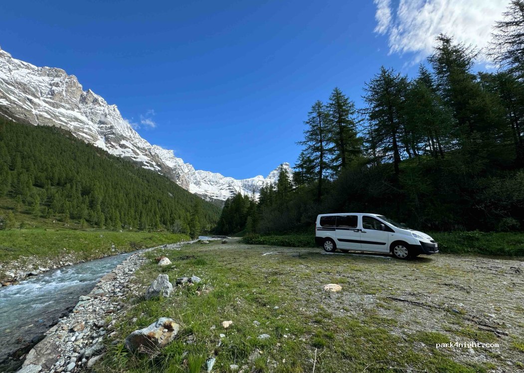 Amazing little spot with incredible views and easy access to Cervinia. Very quiet despite being directly off the main road. Only thing you can hear is the river. Very steep access but brilliant spot. Across the river there is a lake there and fishing club that serves food and drinks with the most incredible views. Free water refill point just up the road too in Cervinia motorhome car park.
