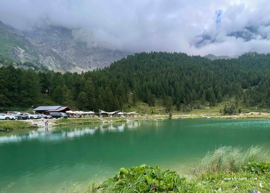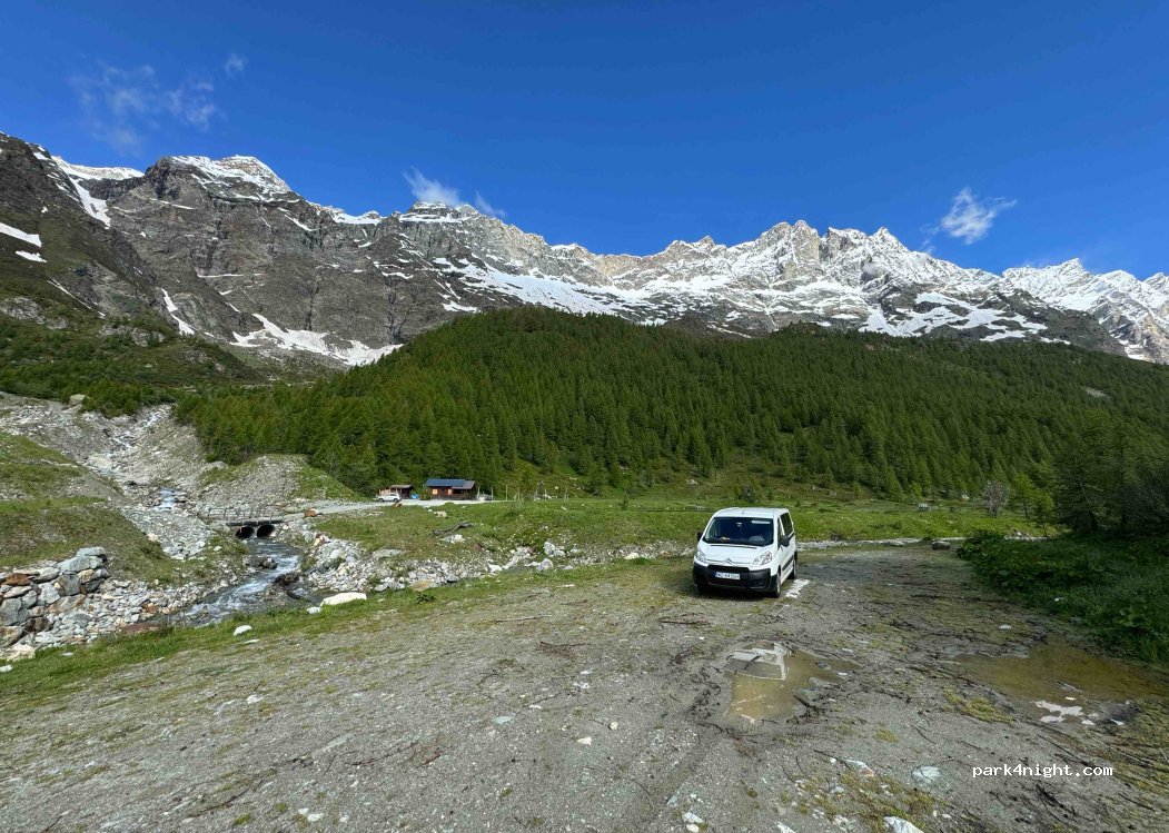 Perfecto para pasar una noche tranquila y muy cerca del Lago Blu y Cervinia. Se encharca un poco cuando llueve mucho. Algo inclinado pero no es muy exagerado. Por las mañanas hay movimiento de camiones de la cantera. Compartimos espacio con otros campistas perohaboa espacio de sobra.