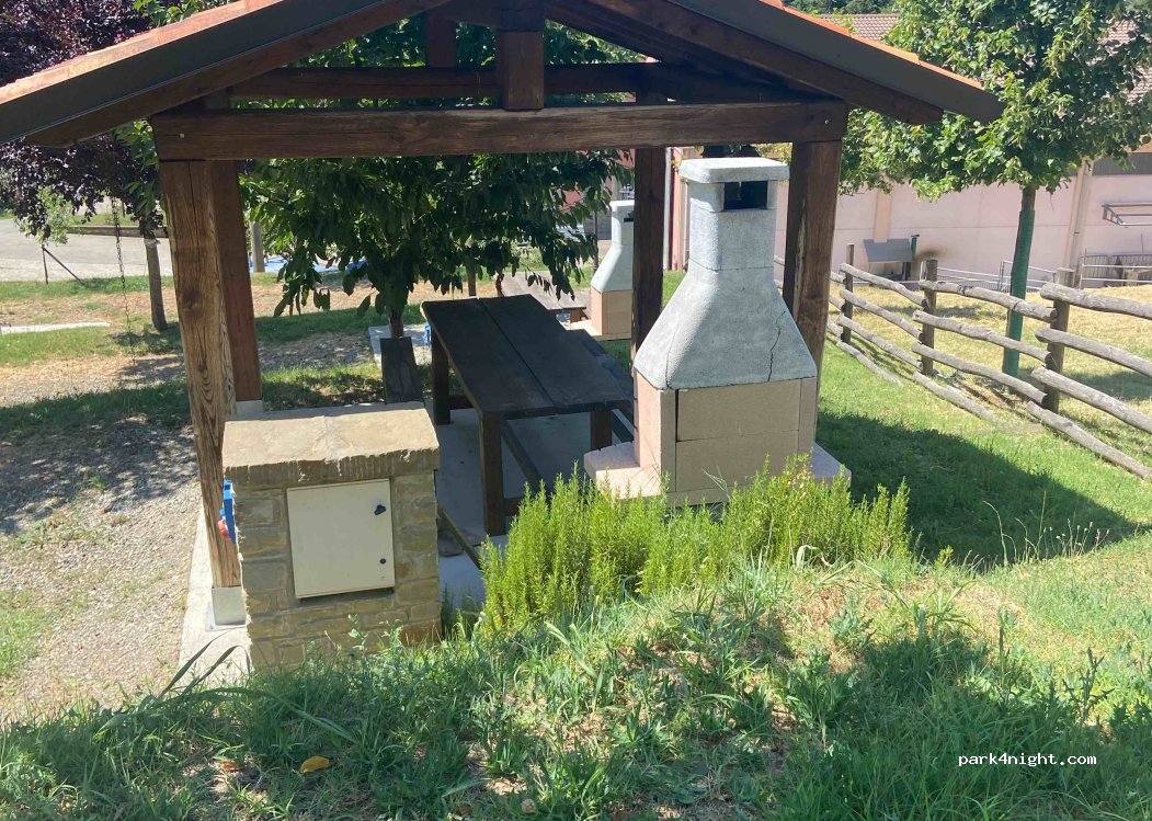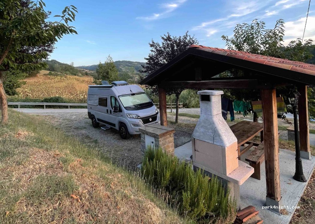 Agriturismo Cascina Adorno - on a hill, surrounded by greenery, you will find this charming cottage nestled above an agricultural farm. If you are lucky, a few camping car/van pitches are available, with comfort worthy of the name: stone barbecue with wood available, water and electricity, but also a table and benches are offered for each pitch! On site, a swimming pool, a playground for children, but also a restaurant open on weekends… for vans that are not autonomous, sanitary facilities (showers and toilets) are available. Finally, I will mention the calm, the cleanliness of the place, the pleasant view of the hills, the sunflower fields...