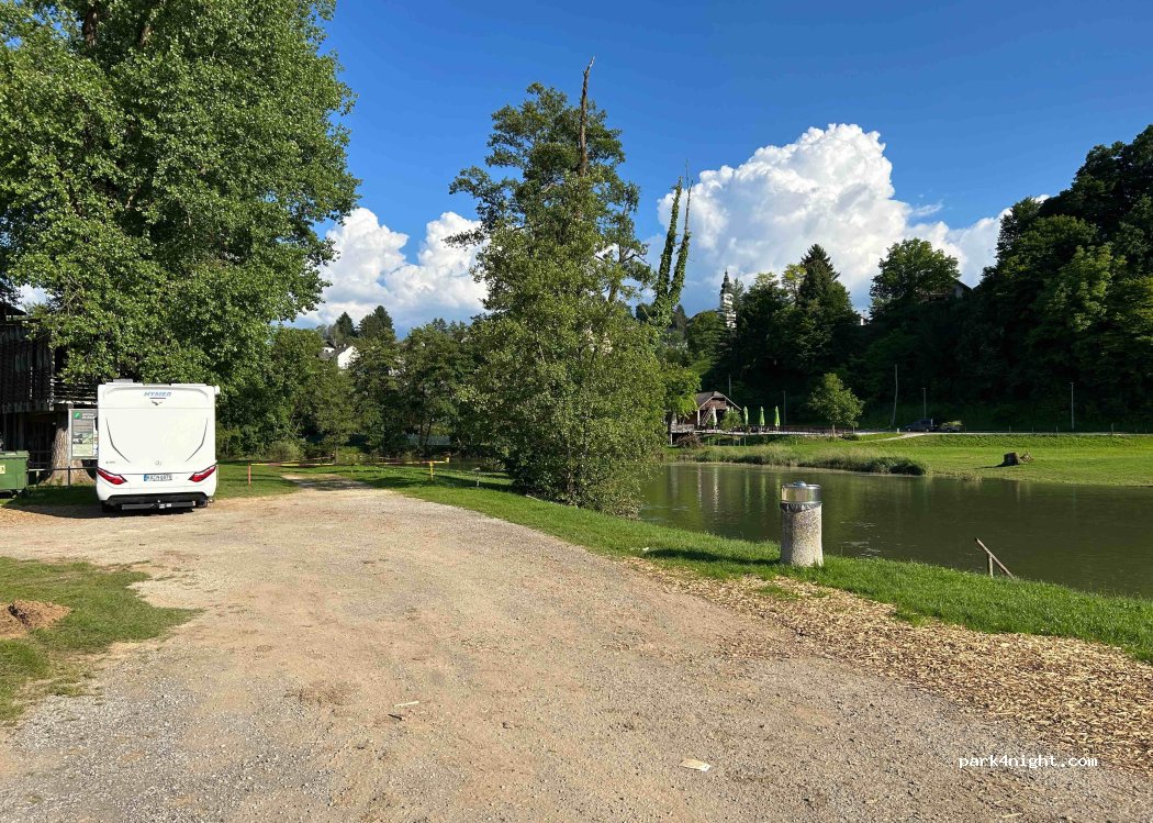 Super place. Parking on grass by the river Krka. Beautiful view on Žužemberk castle. Bating possible during summer months. Also 3 beach volleyball fields by the parking. Could be loud during the day, but peaceful at night.