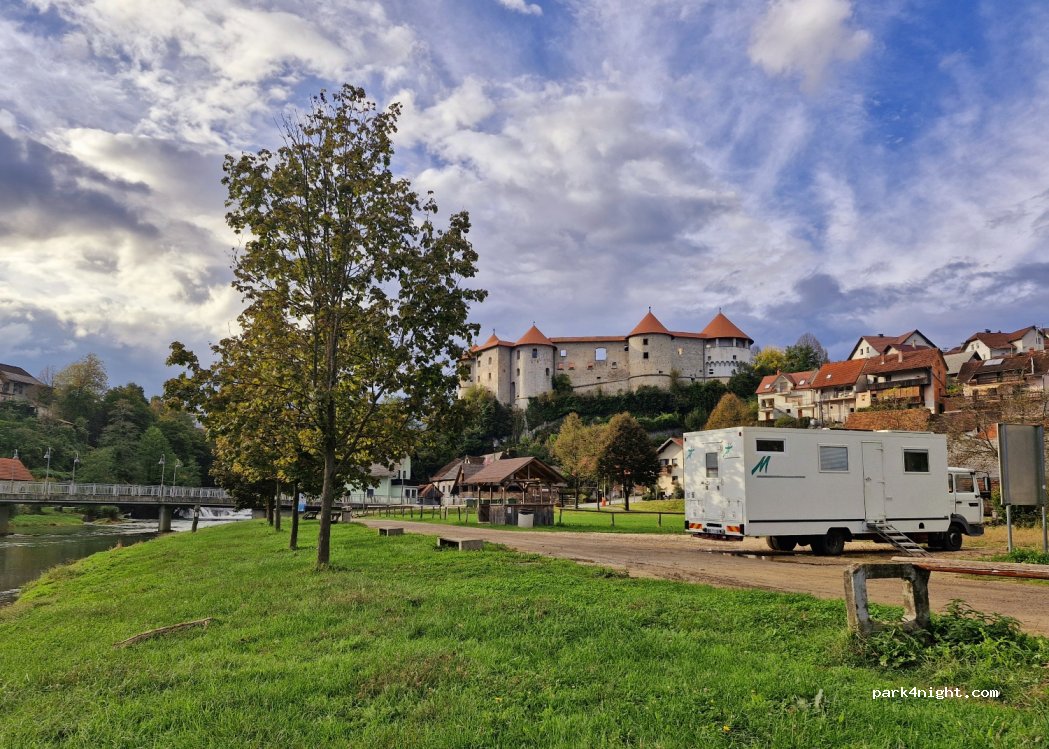 it's free and by a beautiful river and a fantastic view of an ancient castle so thank you very much to the authorities for letting us stay! We had gloomy weather but still enjoyed our stay. The road from Kočevje was winding and a bit worn but didn't cause a problem in our 7m Bessacarr. Good stopover en route to Llubljana and Lake Bled. The Slovenian people are a joy!