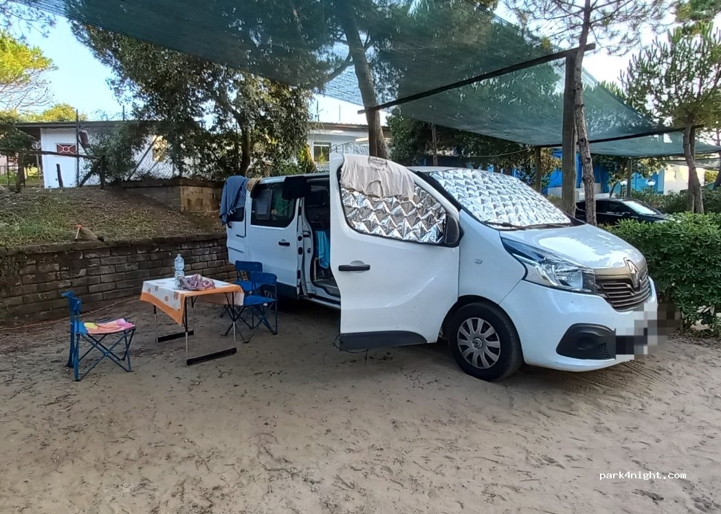 Großer Campingplatz mit großem, von Schatten spendenden Stoffen und Bäumen beschatteten Stellplatz. mehrere Sanitäranlagen. gepflegter Campingplatz. Großer Swimmingpool (Badekappe bereitstellen). Ein Restaurant und ein Minimarkt im Inneren. Direkter Zugang zu einem Privatstrand. Nachts ruhig, tagsüber hört man die nicht weit entfernte Straße.