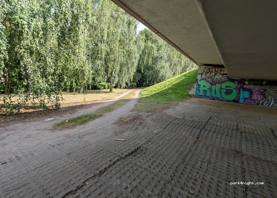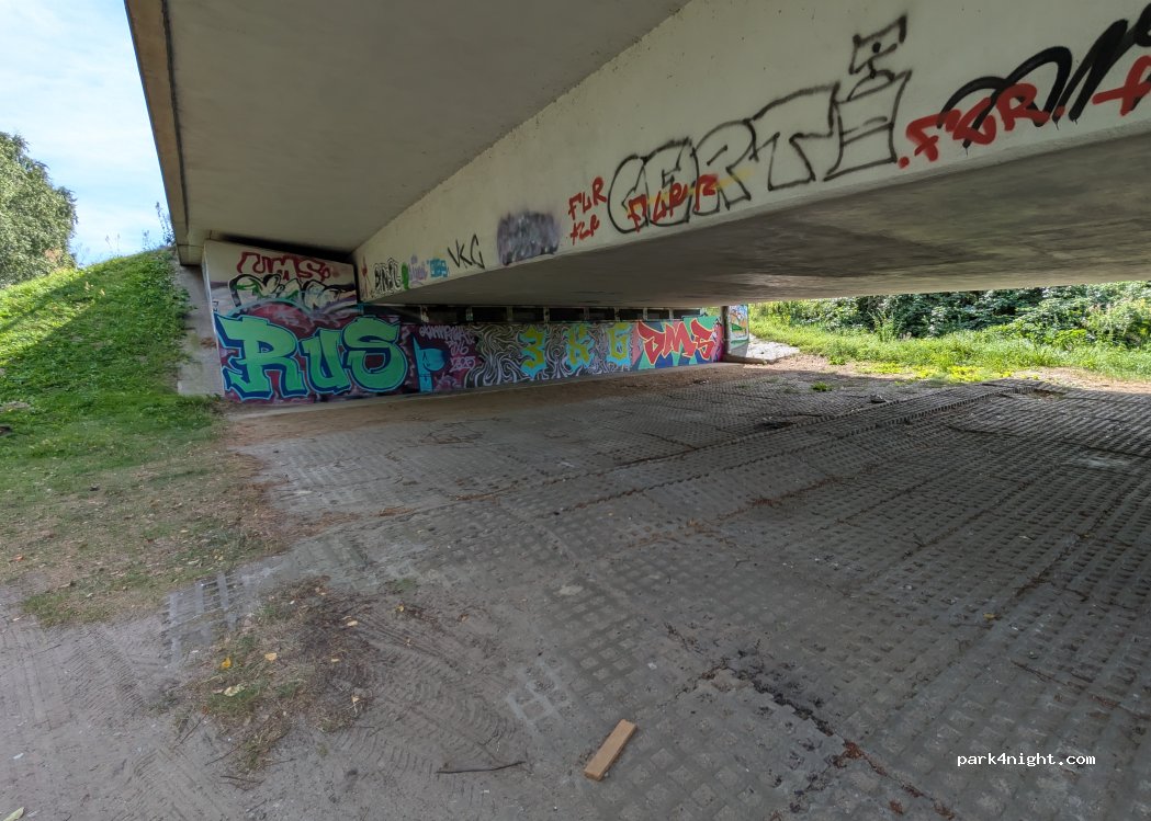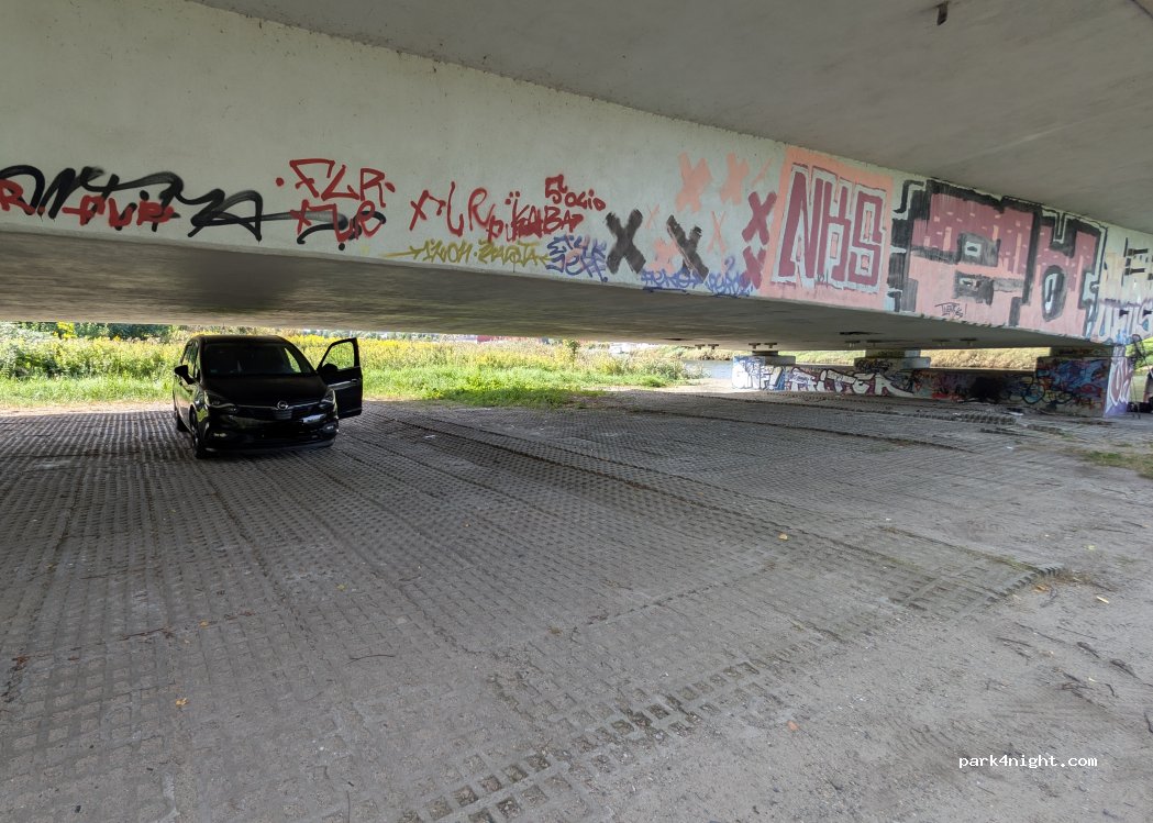 A place under the Vorpommernbrücke, you get there from the main road via a small dirt road and find a place next to a meadow with several birch trees & with access to the water. We could easily stand under the bridge when it rained & we were alone next to a few anglers. It's quite noisy because of the cars above, but it didn't bother us that much. The street lamps provided us with light. A good option when it rains, but the bridge is a maximum of 2.10m deep, so we could only stand under it with a roof box.