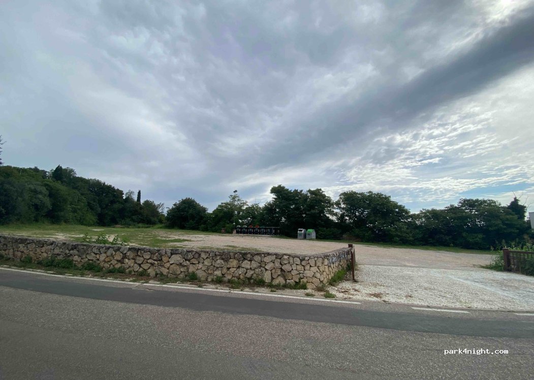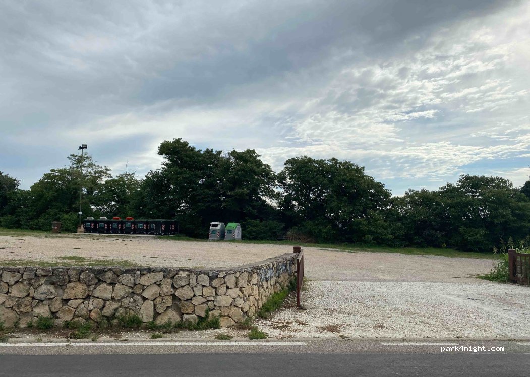 Grand parking sur les hauteurs de Vérone. Nous y étions un vendredi soir donc un peu de musique et de monde dans le bar d'en face jusqu'à 1h du mat mais c'était supportable. Poubelles à disposition et tranquille le matin. Juste passage de quelques cyclistes.