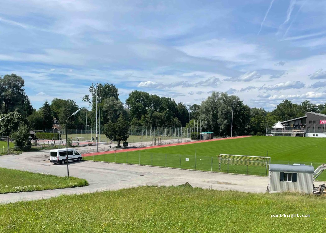 Kostenloser Parkplatz am Fußballplatz. Nachts ruhig. Mülleimer vorhanden. Für eine Nacht oder Pause gut geeignet.