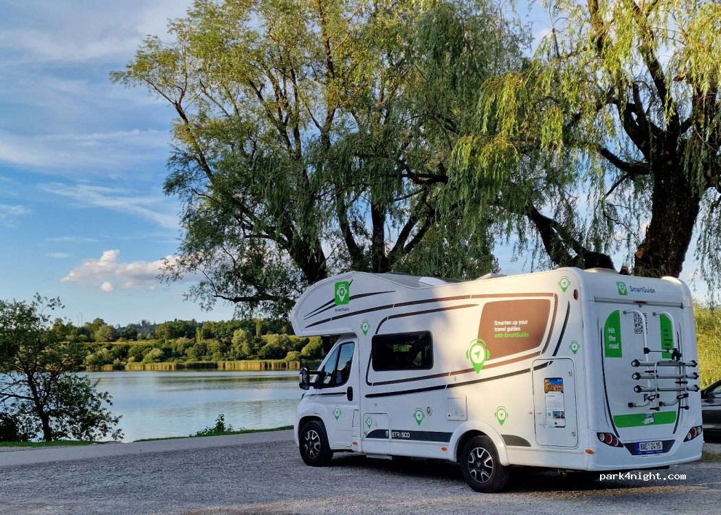 parking gratuit super restaurant à côté Le lac magnifique baignade paddel buvette au bord de plage Avons mangé au restaurant et demandé si nous pouvions dormir sur le parking et aucun problème...