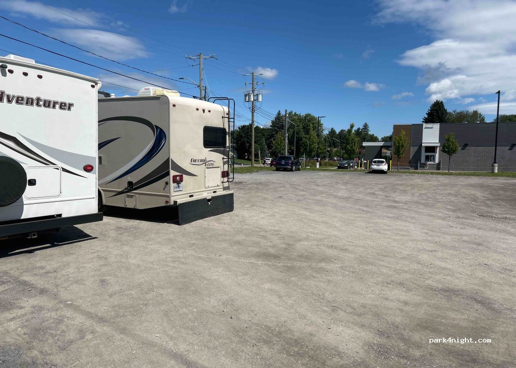 Pas de signalisation concernant le stationnement, derrière la station service et devant le McDo service au volant. Donc du passage au soir et au matin. Beaucoup de passage de voitures, pas trop d'intimité. Cependant c'est dans une zone résidentielle donc sécuritaire. Calme entre minuit et 5h. Nous avons passé 1 nuit. Ça peut dépanner et c'est assez plat.