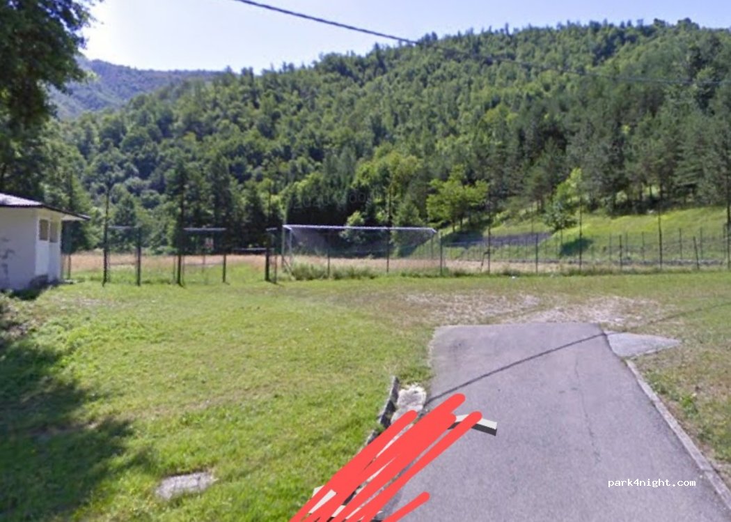 Parcheggio gratuito accanto ad un campo da calcio e ad abitazione.