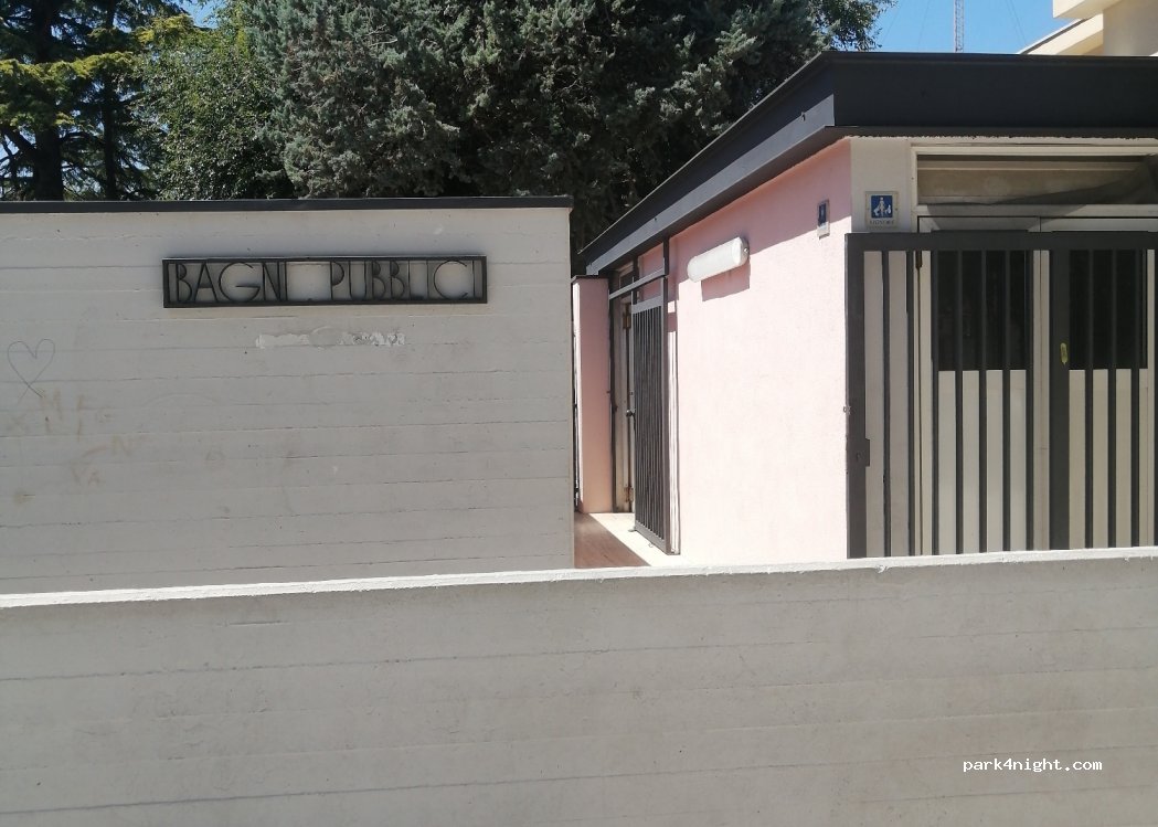 Bagno pubblico gratuito vicino a un mercato/fiera probabilmente aperto 24 ore. La sera relativamente molti locali in fiera. Giostra per bambini e parco giochi sono accanto.