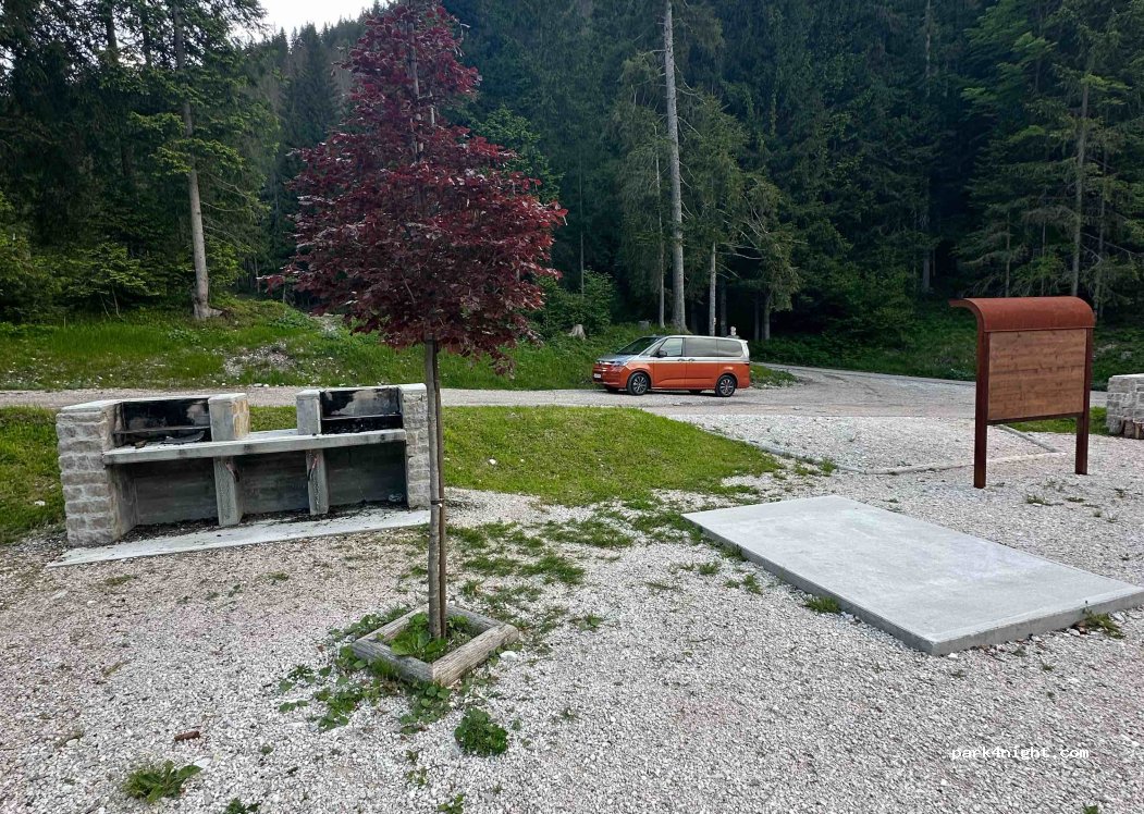 Wir waren eine Nacht allein da, kein Verbotsschild, niemand hat gestört. Zufahrt eher nur mit Van. Parkplatz gerade voll mit Holz, standen an der Seite . Sehr gute Aussicht auf die Berge abends beim Sitzen auf der Bank. Am nächsten Morgen eine tolle Wanderung zu Rifugio Ciareido, tolles Essen mit toller Aussicht . Sollte man auf jeden Fall mit der Übernachtung kombinieren.