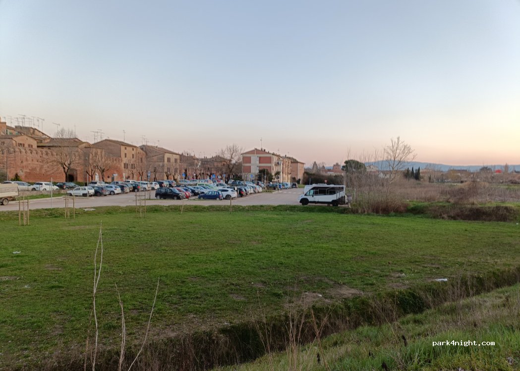 Ottimo punto sosta, proprio di fronte alla porta di accesso al borgo storico, con piazzole ampie e ben delimitate. A circa 200 metri supermercato Coop. Non do 5 stelle solo perché non ci sono servizi ma comunque, poco lontano, c' è la stazione di carico e scarico comunale. Al momento è ancora gratis.