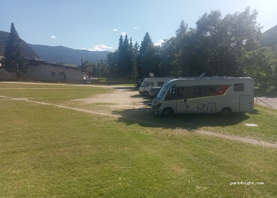 Ottimo parcheggio gratuito su erba per strutture sportive, parco giochi e laghetto artificiale. Vicinissimo alla ciclabile per Brunico. Noi ci abbiamo passato qualche ora ma è possibile sostare anche la notte.