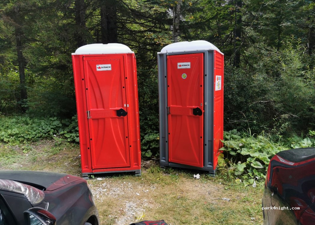 Parcheggio pubblico in ghiaia con servizi igienici. Campeggio non consentito. C'è un lago pulito vicino, puoi fare il bagno.