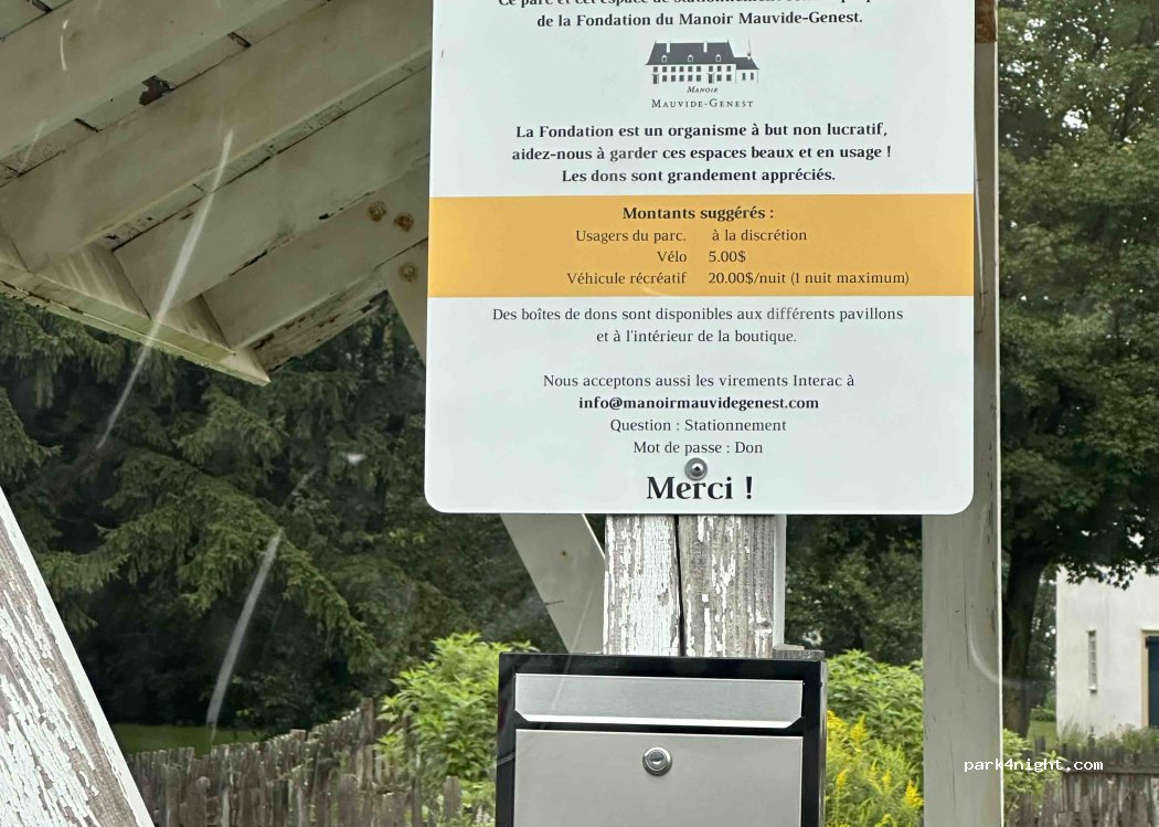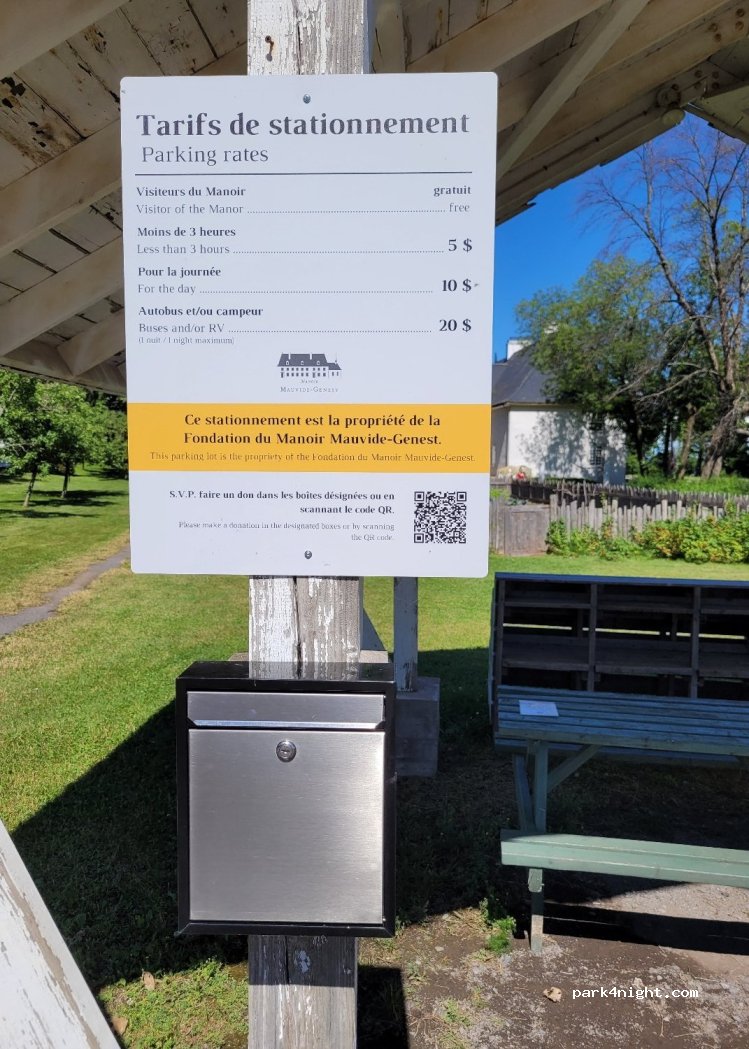 Grand Stationnement de nuit disponible. Une nuit maximum. Don pour le Manoir Mauvide-Genest. Super tranquille. Pas grand chose à faire autour cependant.