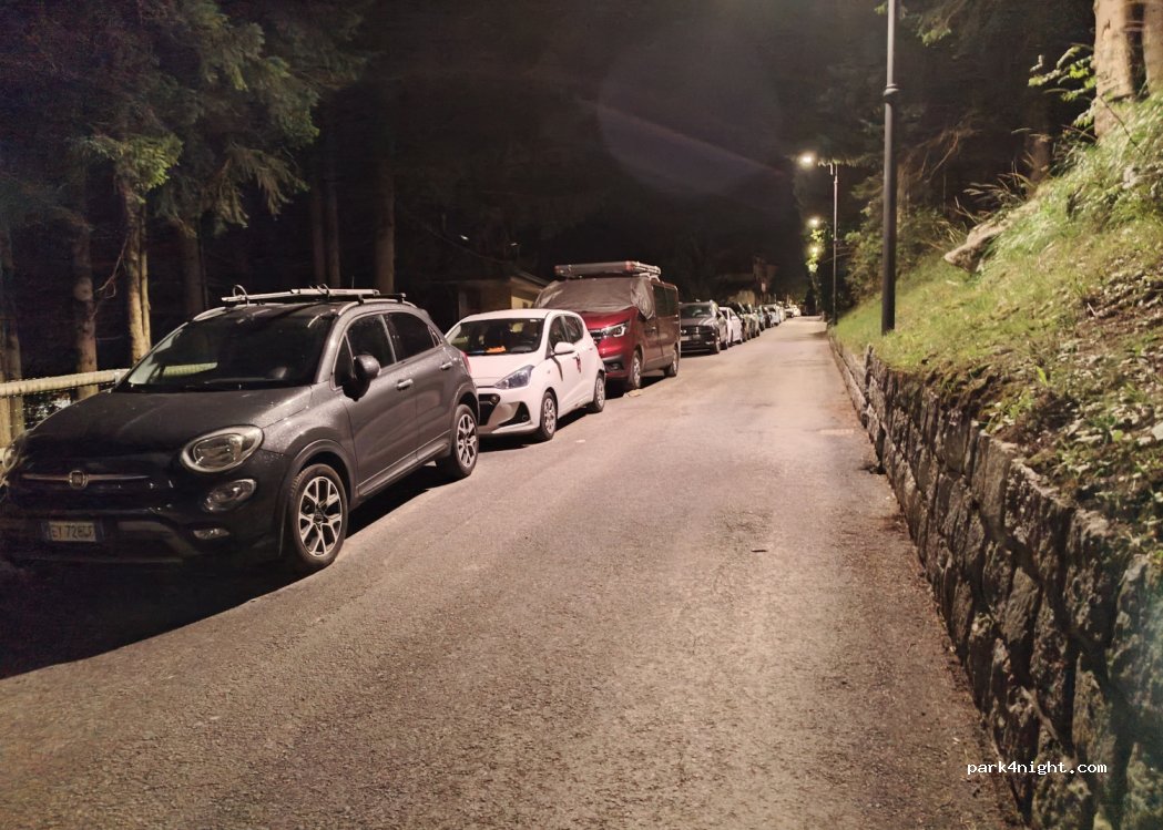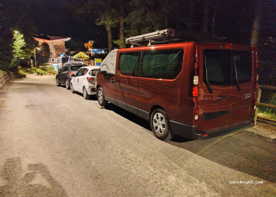 Free parking place for vans in Madonna di Campiglio. During the day it could be hard to find a place, but during the evening we found 4 in peak of season (August). It is surrounded by trees. During the night peace and quiet. Close to the centre, cable cars and supermarket.