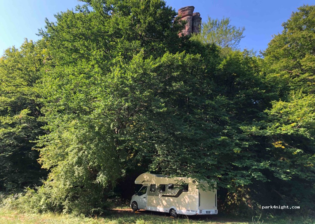 Nahezu ganztägig schattiger Platz. Leicht geneigt. Von hier aus kann man problemlos zur Burg oder in die Stadt wandern. Zufahrt von Süden über Schotterstraße.